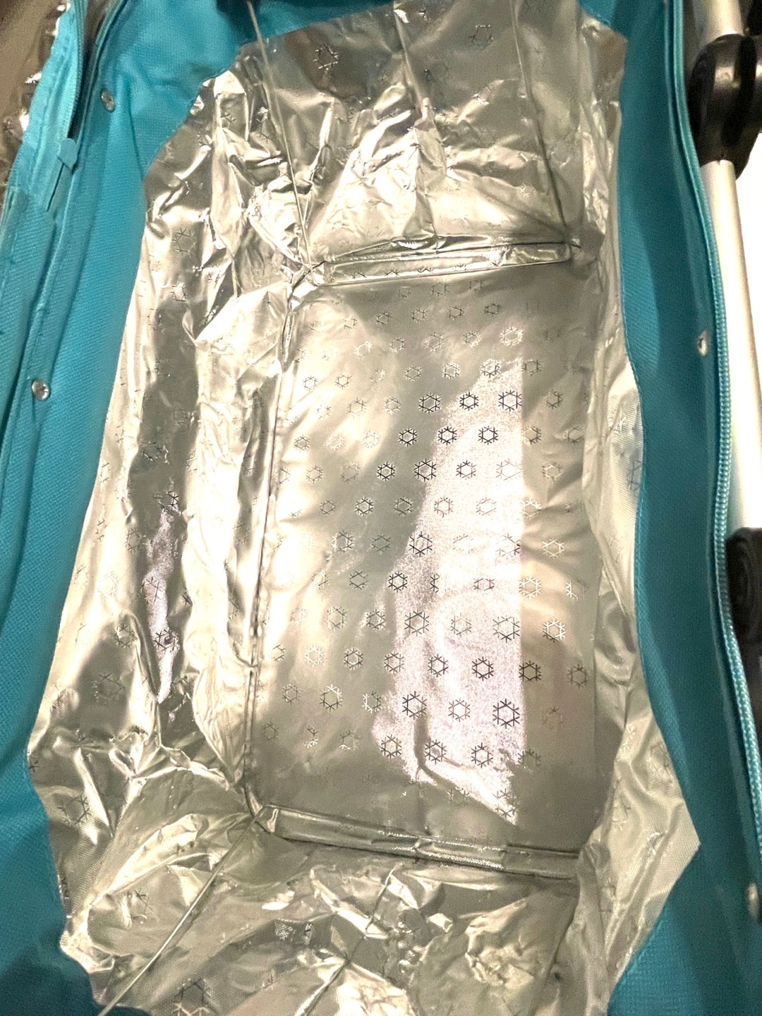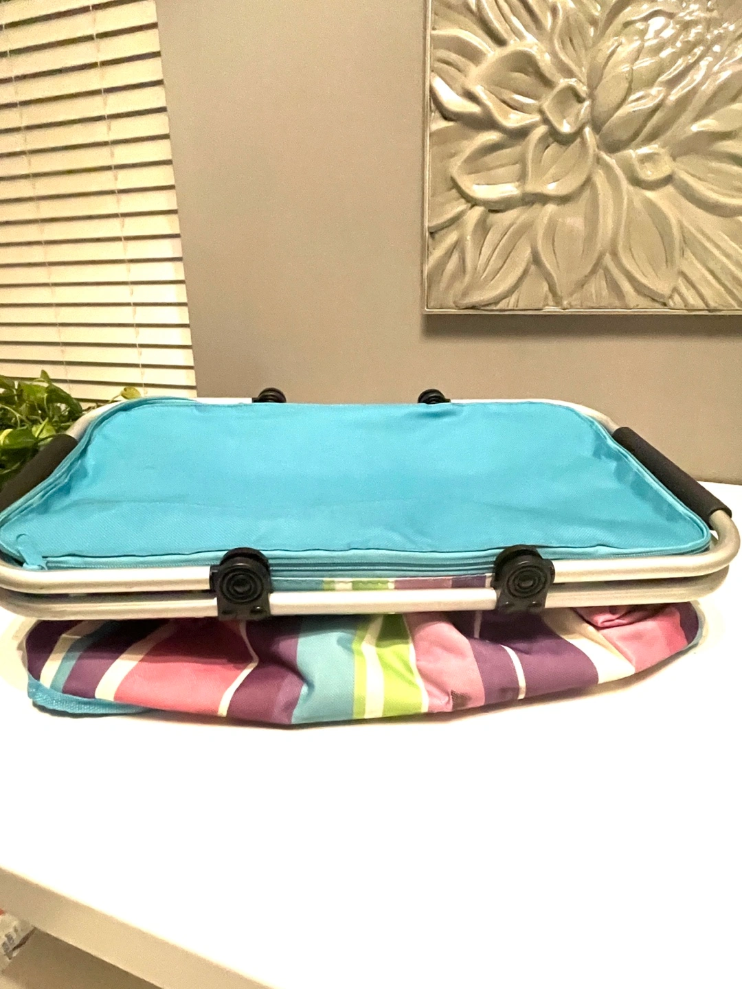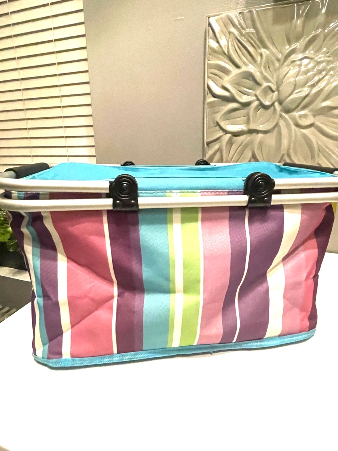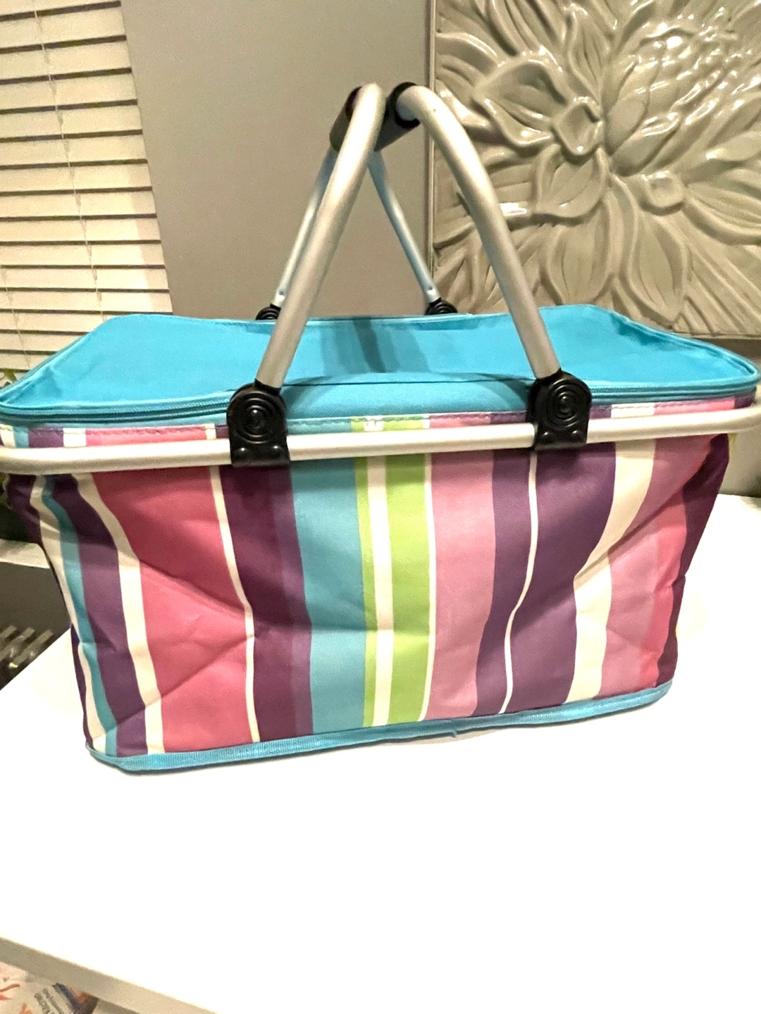 Collapsible picnic basket. Features a teal top and colorful striped pattern. Insulated interior with aluminum lining. Metal frame and handles.