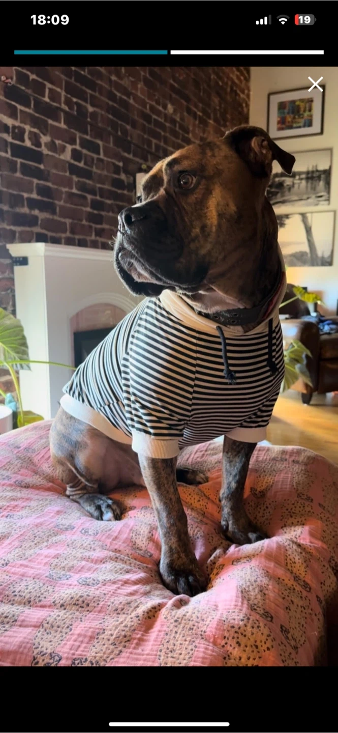 88Striped hoodie for your furry friend! This is a black and white striped hoodie, perfect for fall and winter. It's a size 7XL, great for medium to large dogs. Keep your pup cozy and stylish!