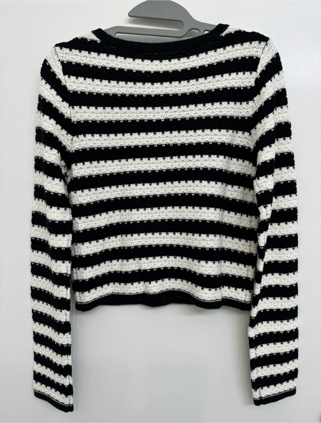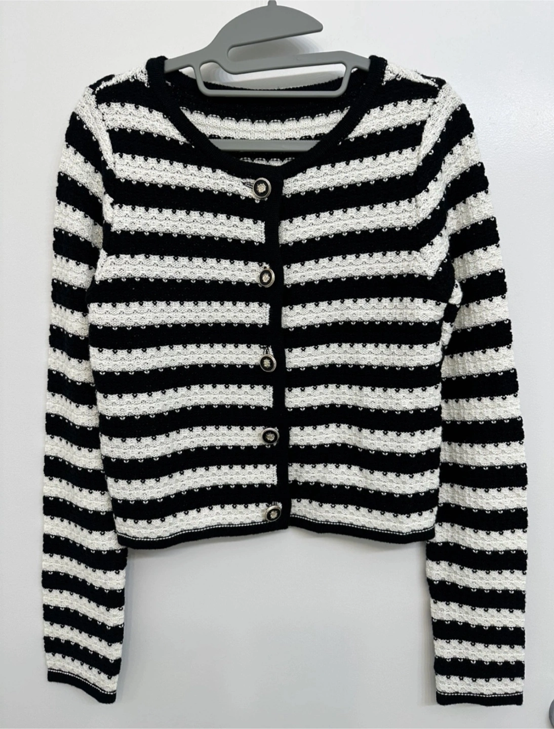 1000+Here's a stylish striped knit cardigan! It's perfect for layering or wearing on its own. The black and white stripes make it versatile for any outfit. It's in great condition and ready for a new home