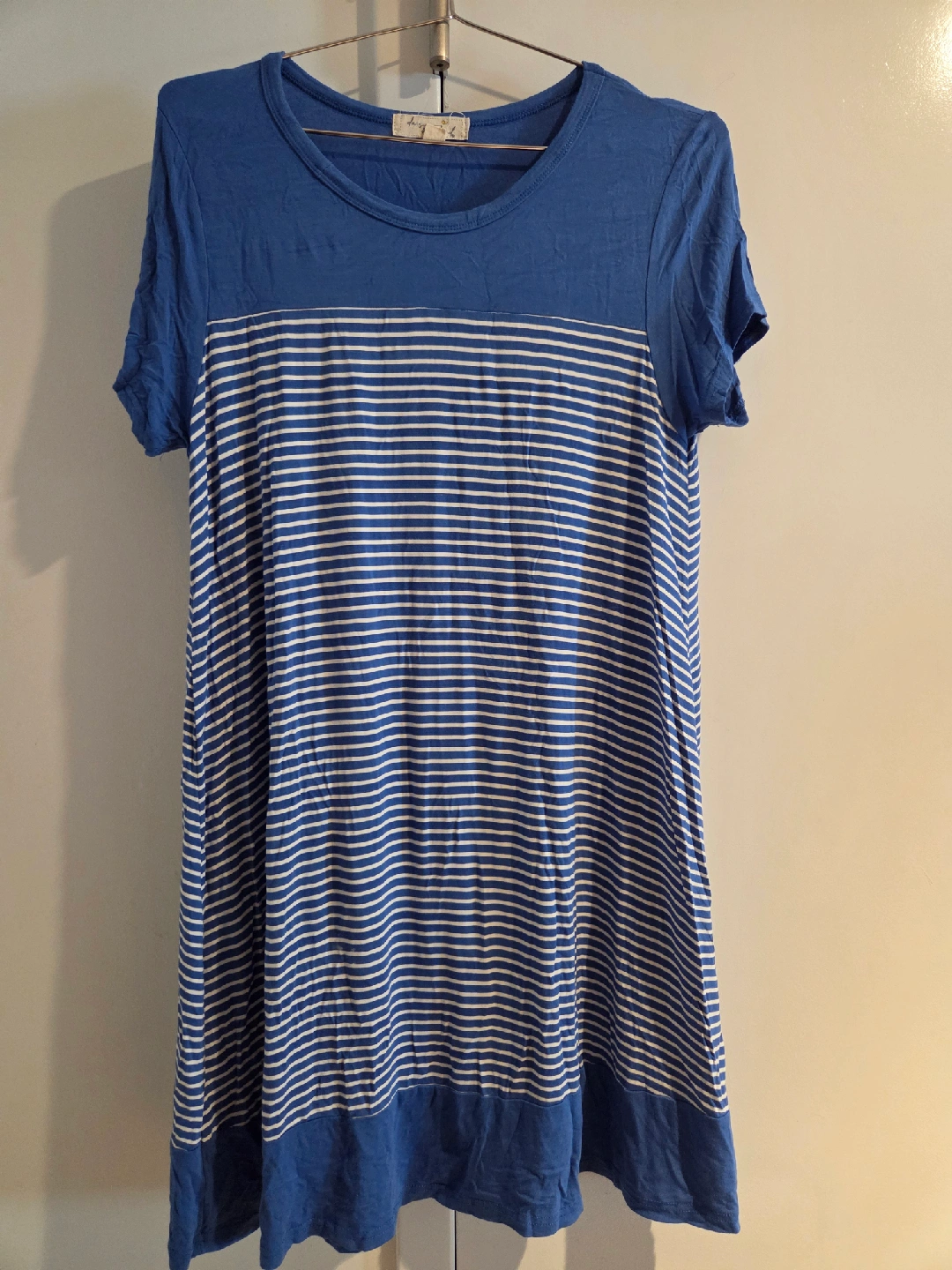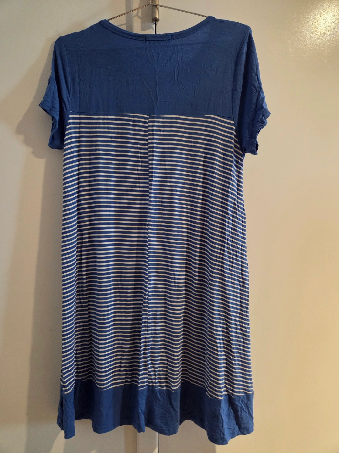 This is a cute blue and white striped short sleeve dress. It's in great condition and perfect for casual wear. It's a comfortable and stylish addition to any wardrobe!