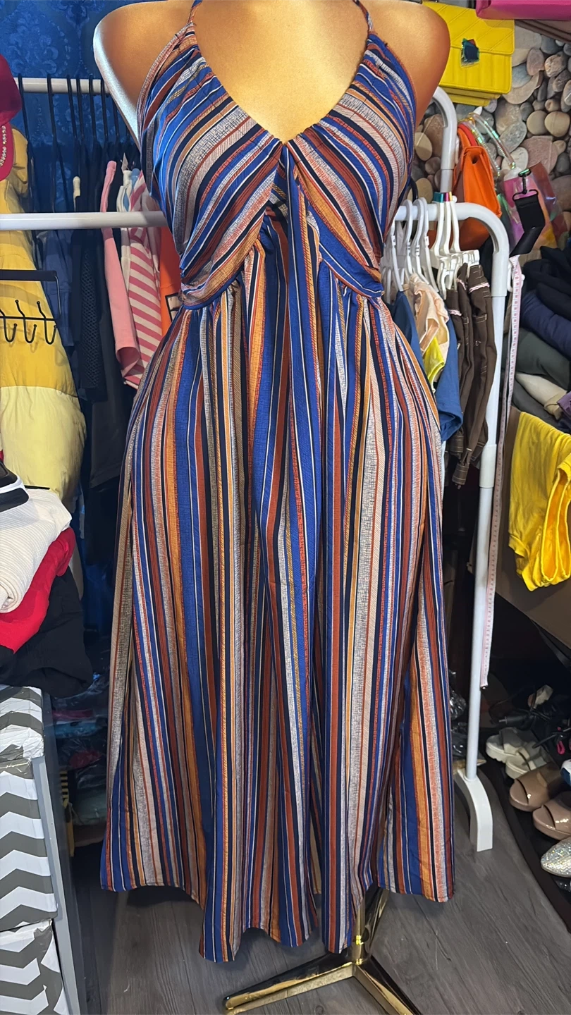 This is a cute striped sundress with a halter top style. The colors are blue, orange, and white in a vertical stripe pattern. It's a great dress for warm weather!