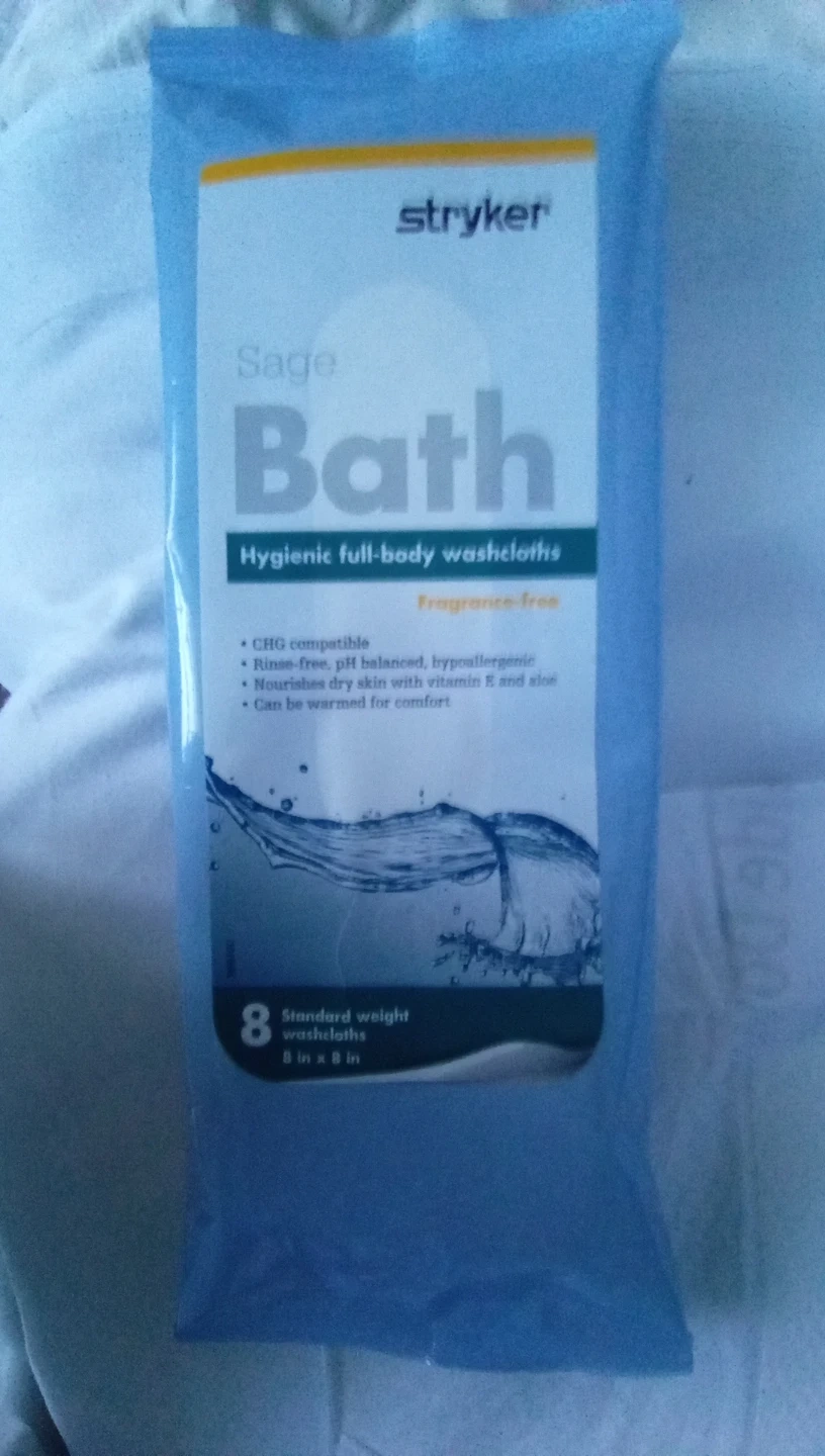1000+20 packs of 8 sheets Available. Selling a pack of Stryker Sage Bath hygienic full-body washcloths. These are fragrance-free and CHG compatible. They're also rinse-free, pH balanced, and hypoallergenic. Each cloth is infused with vitamin E and aloe to nourish dry skin, and they can even be warmed for extra comfort. You get 8 standard weight washcloths, each measuring 8 in x 8 in