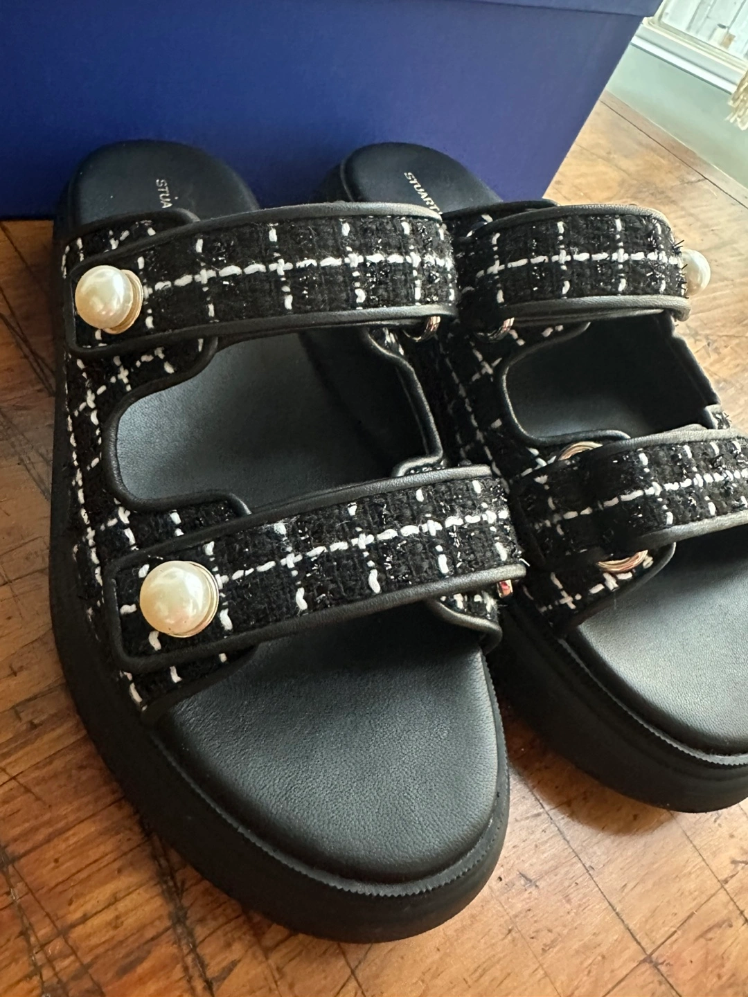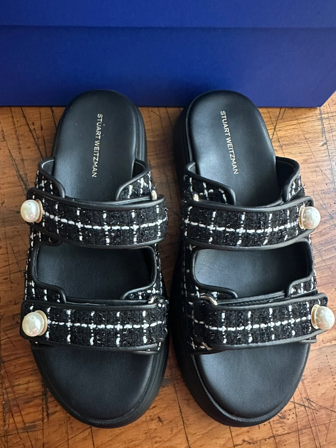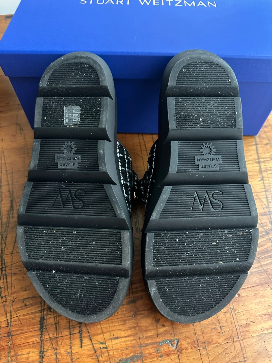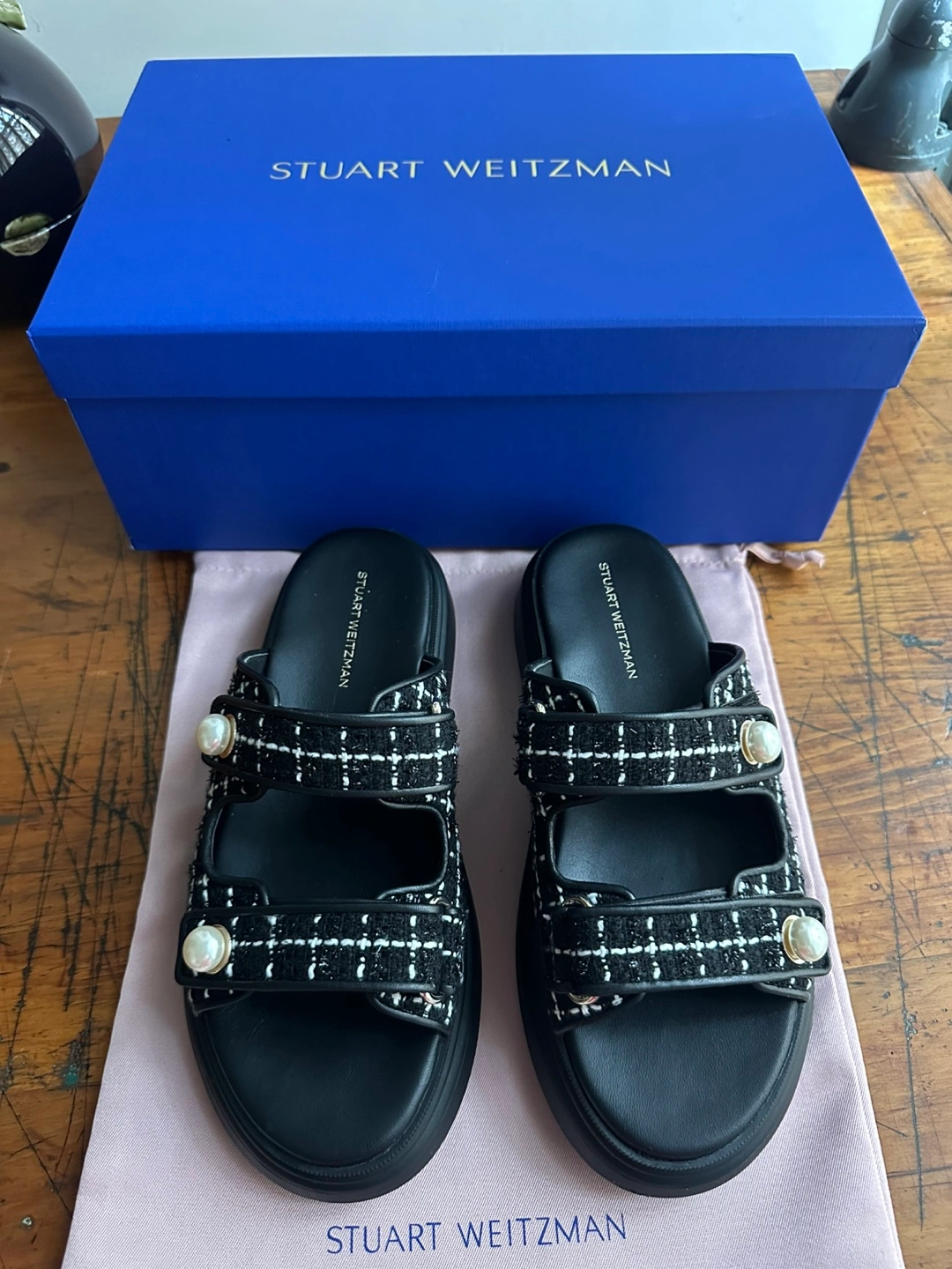 Stuart Weitzman Goldie Pearl Tweed Black Sandals Sport Slide