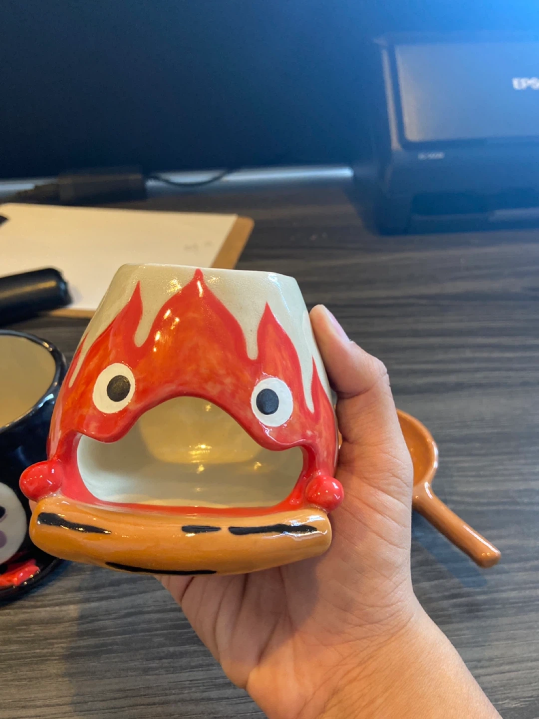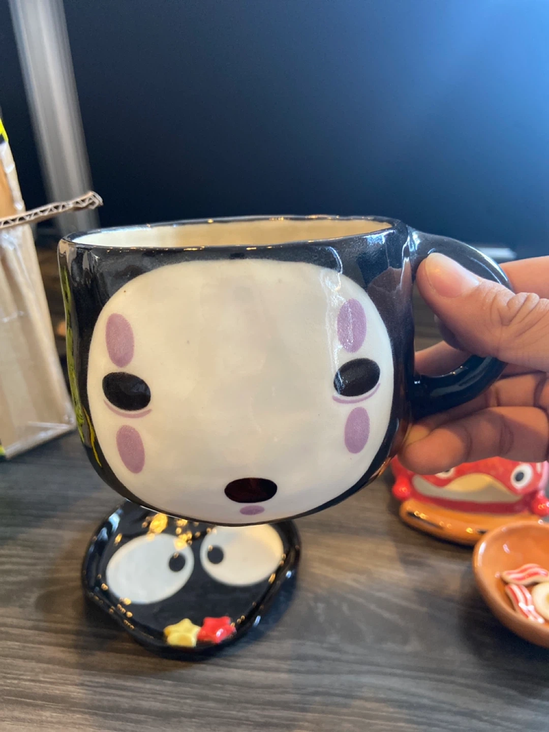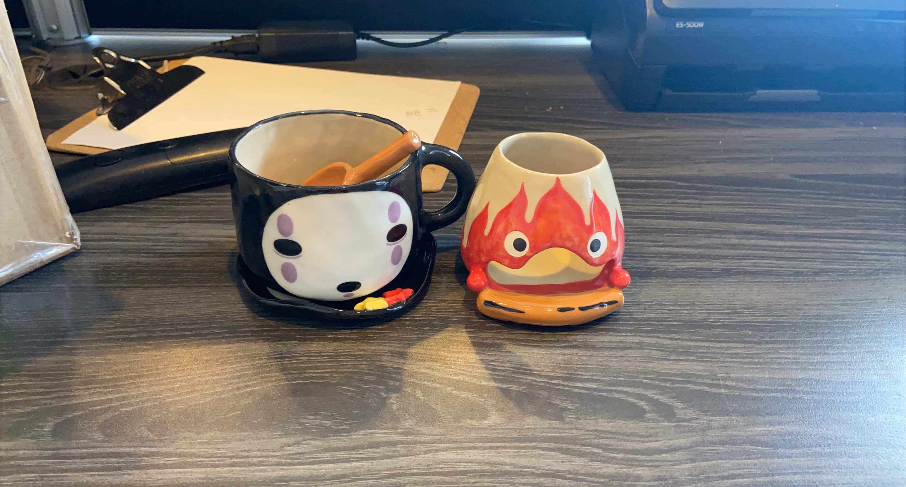 I have a couple of Studio Ghibli character mugs for sale! One is a Calcifer mug from Howl's Moving Castle and the other is a No-Face mug from Spirited Away. They're both in great condition and ready for a new home