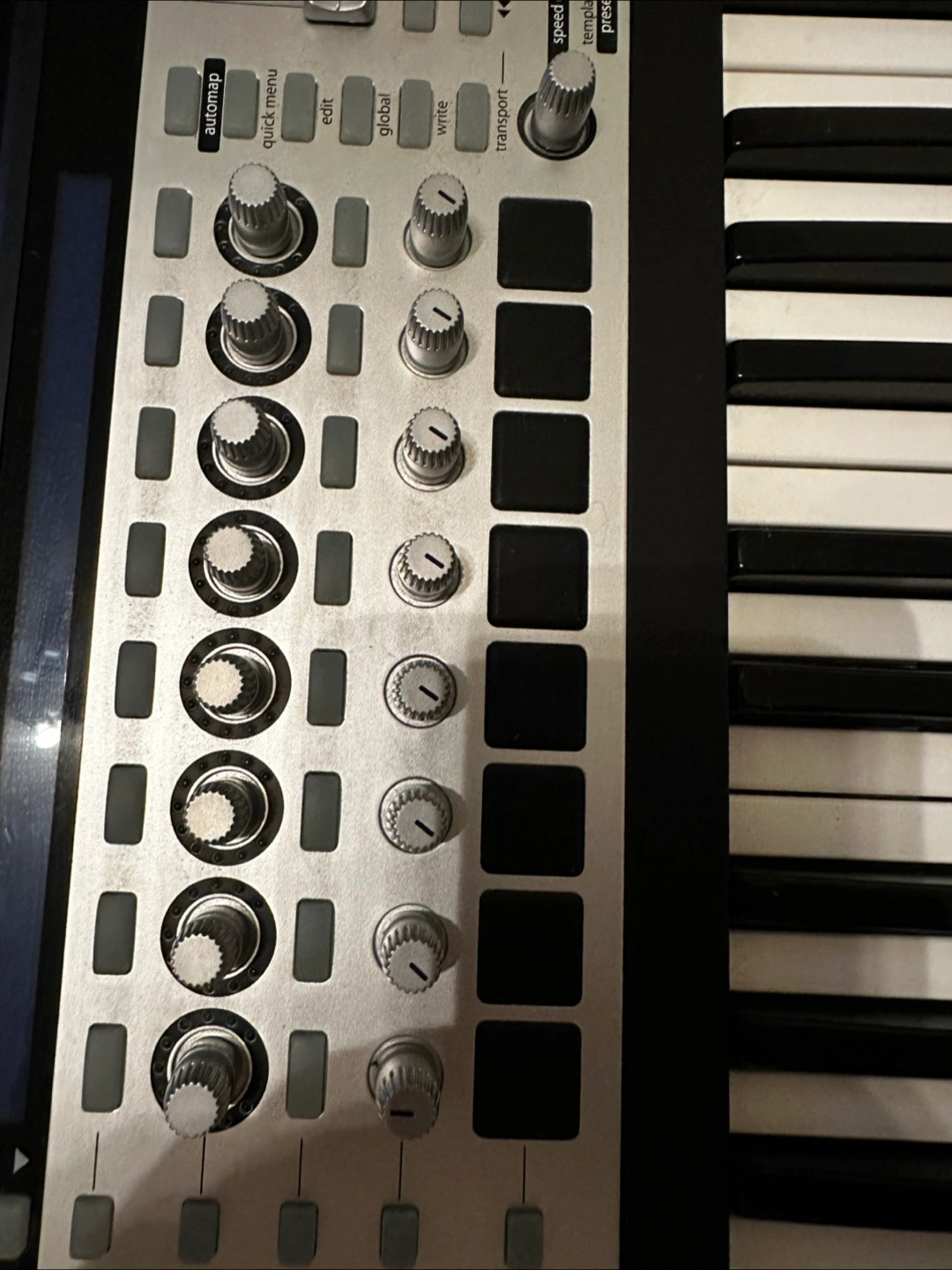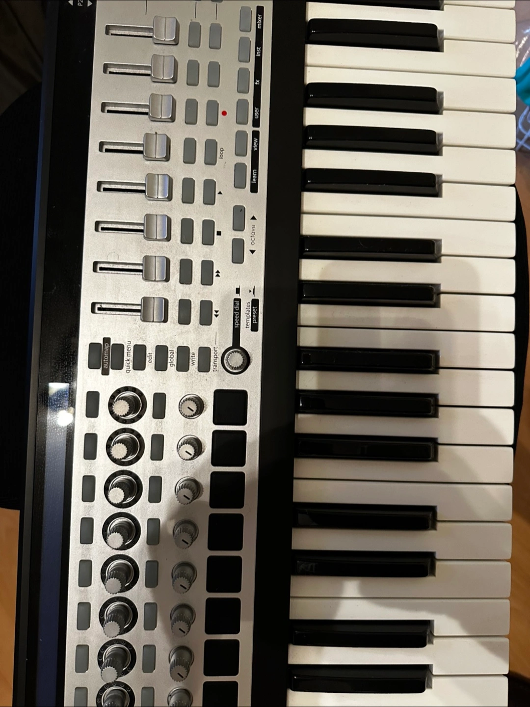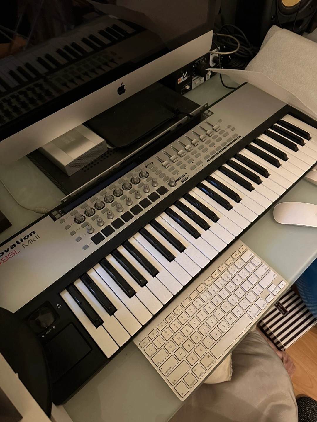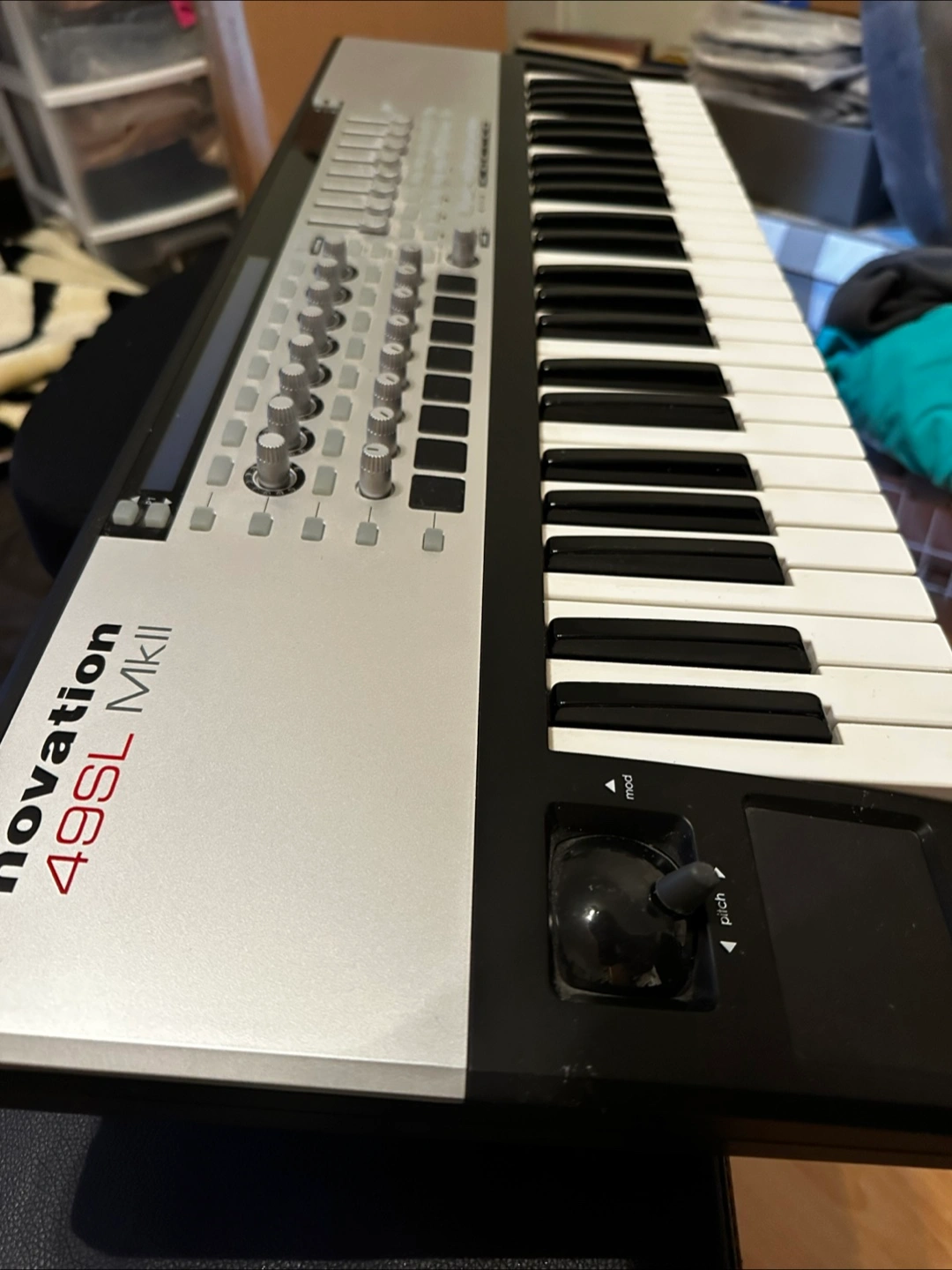 6349-key MIDI keyboard controller. Includes pitch and modulation wheels. Multiple knobs and buttons. Great for music production.
