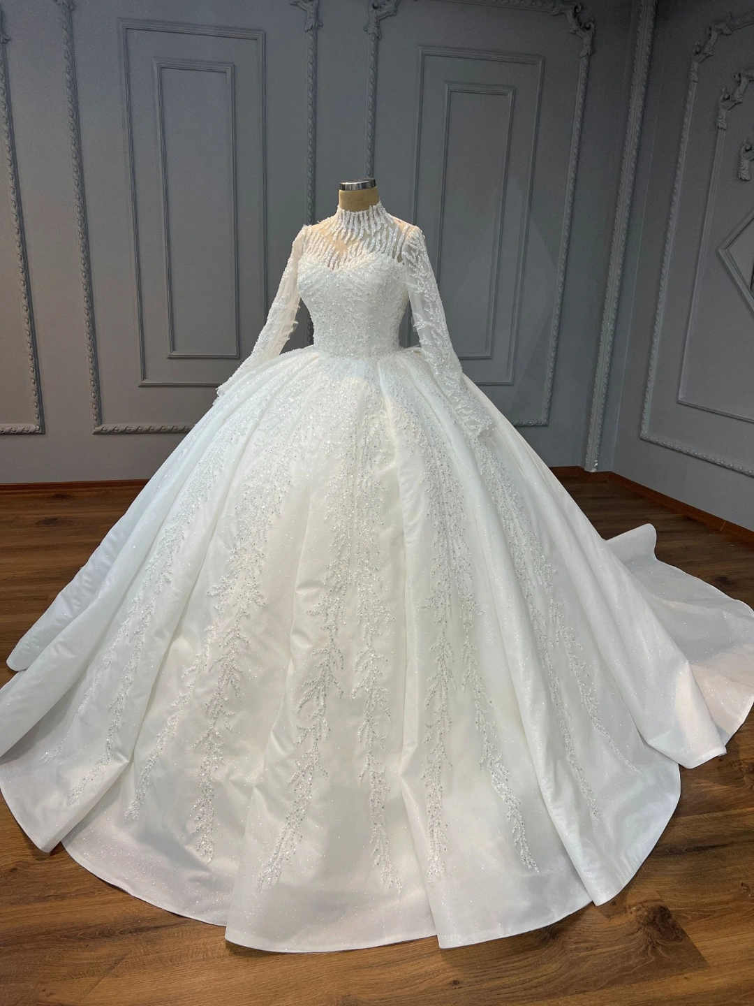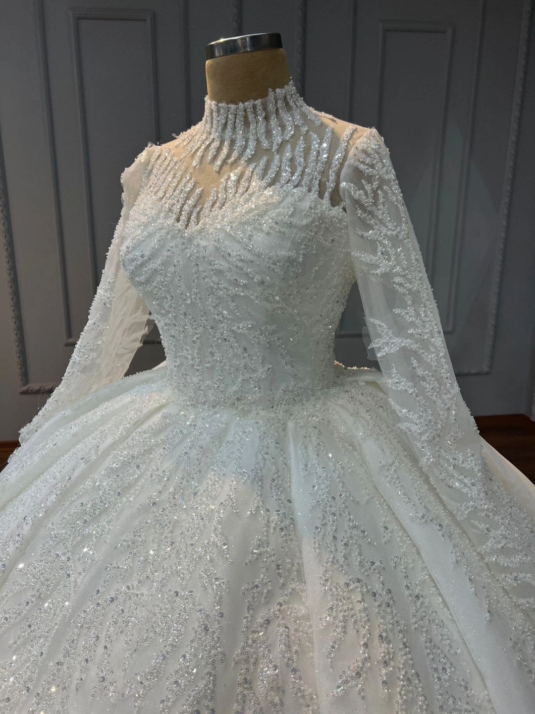 Gorgeous ballgown wedding dress. Long sleeves, high neck, fully beaded bodice and skirt. Beautiful train. Perfect for a bride looking for a glamorous and elegant look.