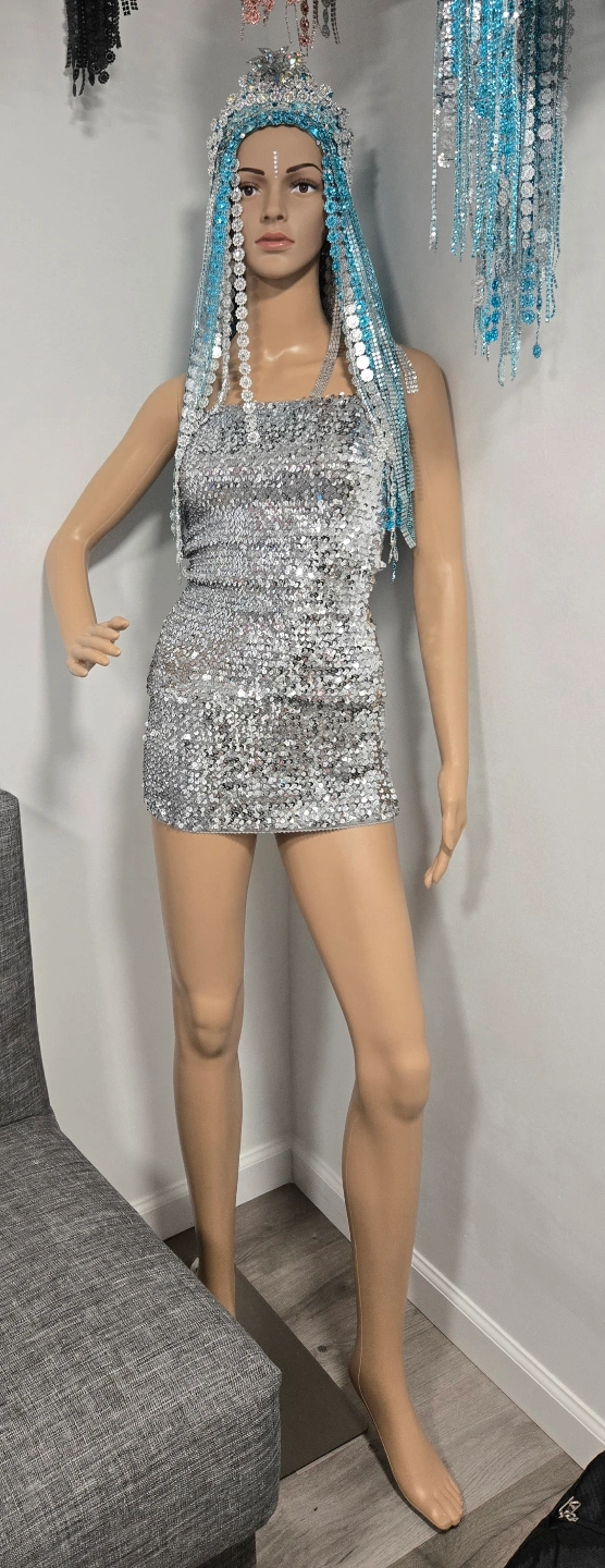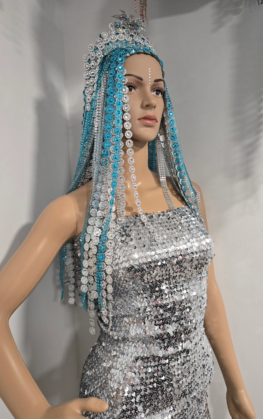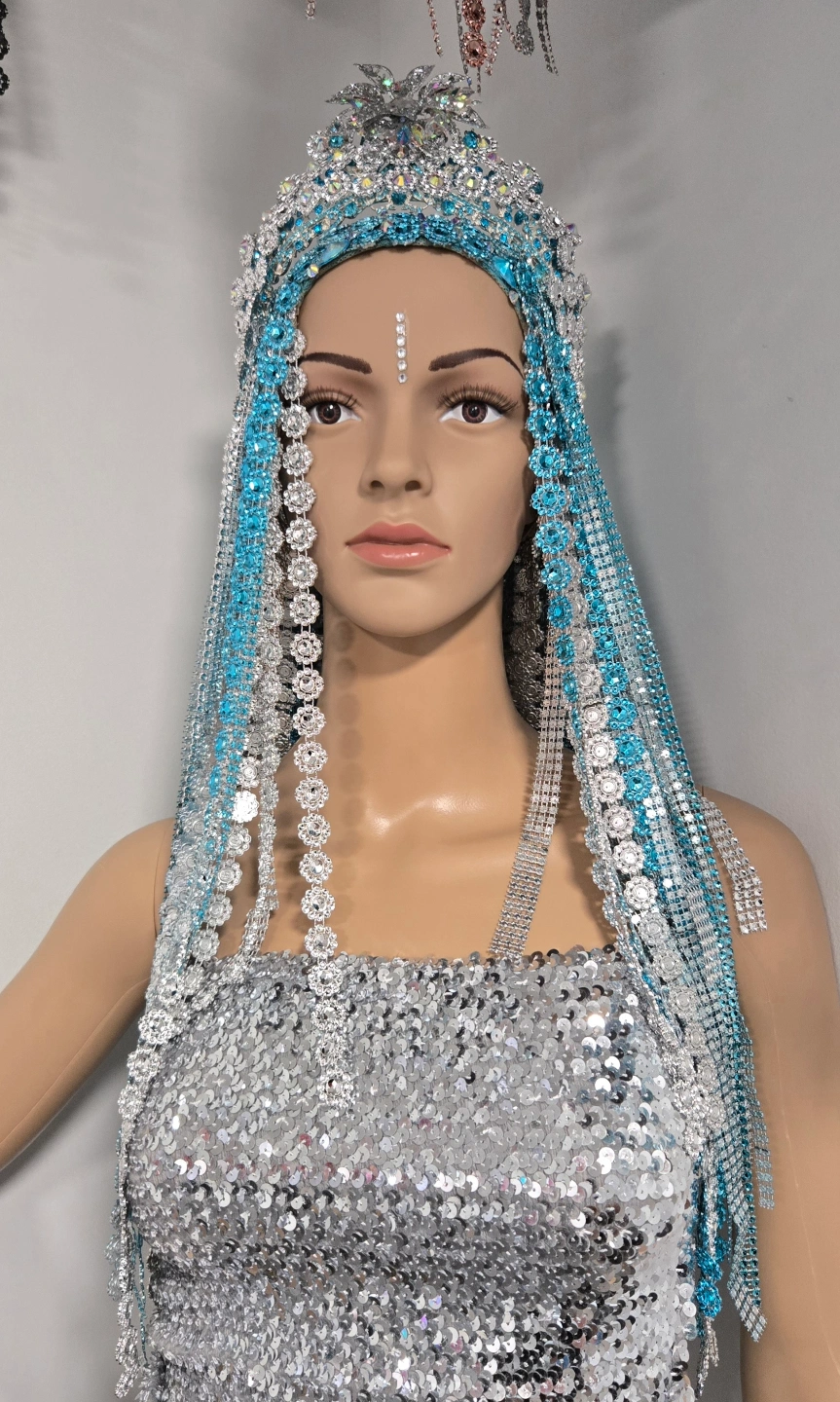 Gorgeous, handmade headpiece and mini dress. Light blue and silver crystals and beads. Perfect for a showgirl, performer, or special occasion. Headpiece features elaborate detailing and long, flowing strands. Dress features a dazzling sequin fabric. Eye-catching and unique. Costume Design by Natasha Berezhnaya ✨️
