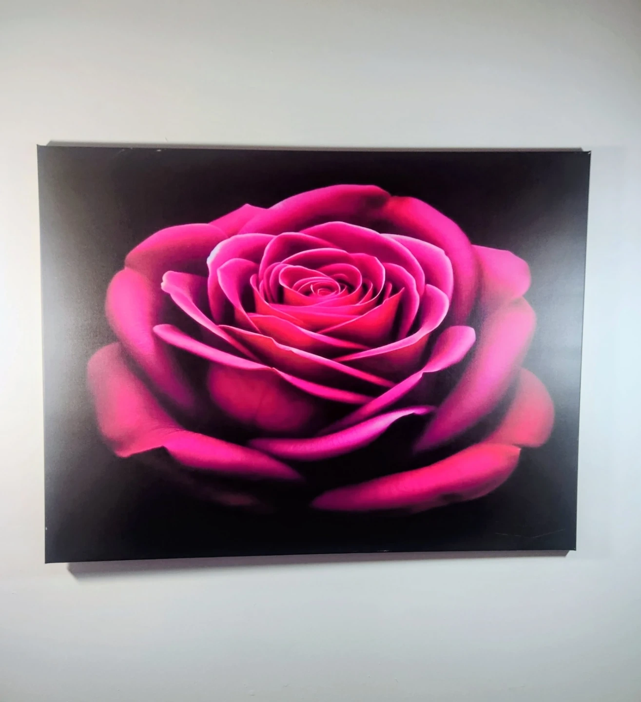 68A beautiful rose painting that would look great in any room. I created this piece and it is one of a kind. The stunning contrast between the vibrance of the pink floral centerpiece and the black abyss create a masterpiece. Enjoy! There are minor scratches that can be fixed by an art shop.