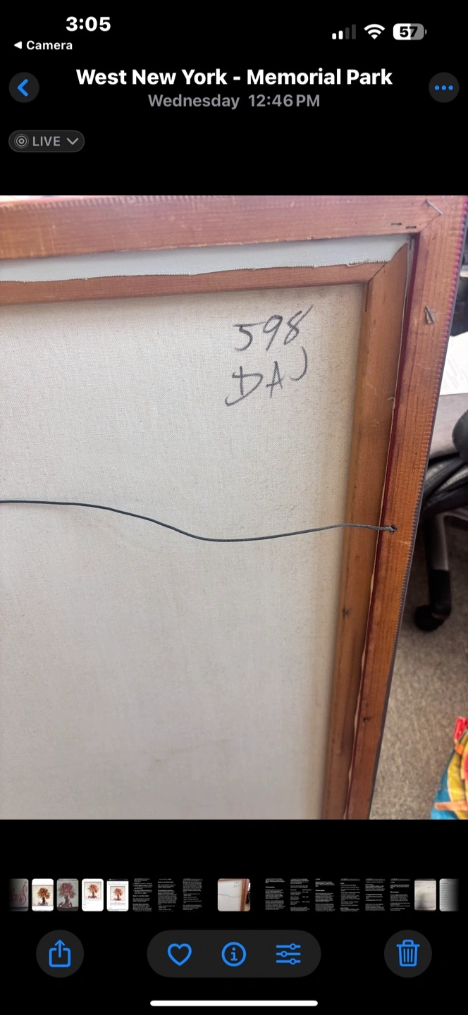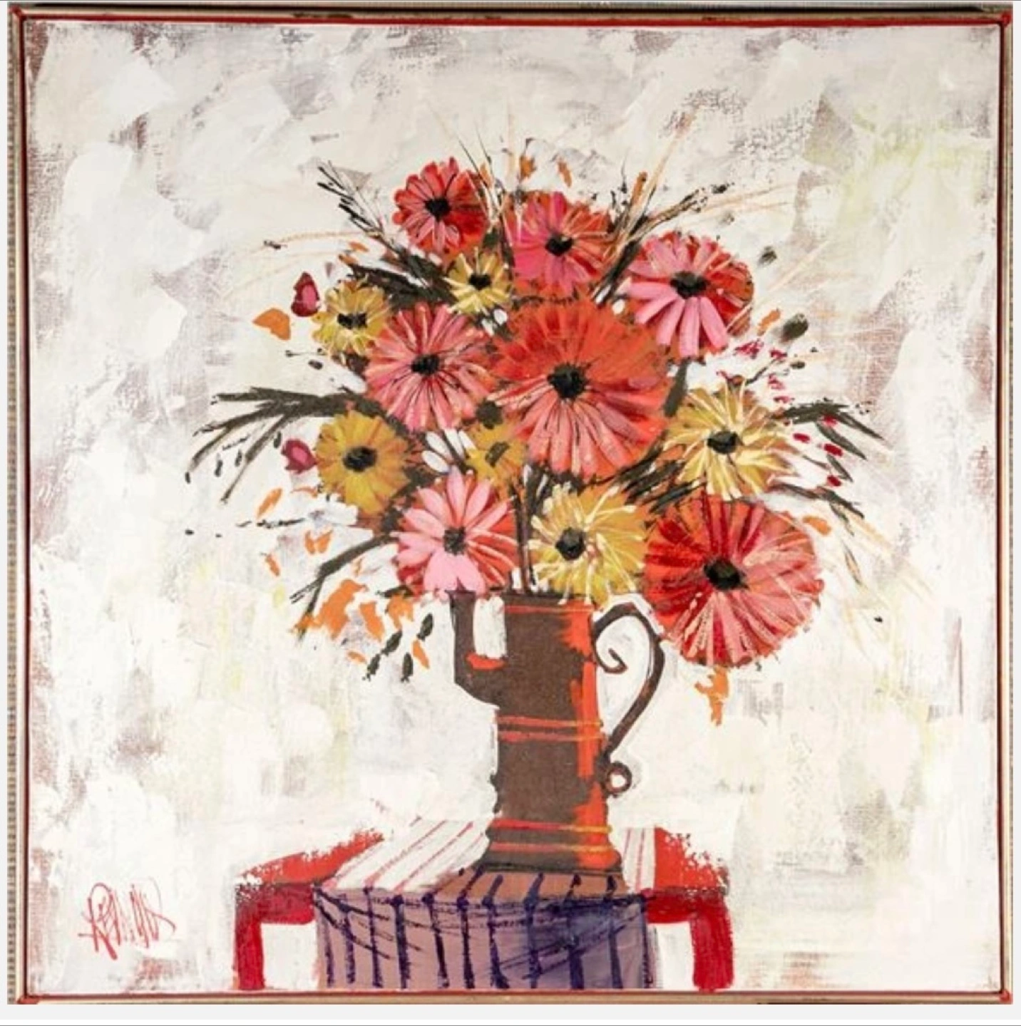47Hand-Painted Canvas- Not a print! Artist: Lee Reynolds Beautiful vintage mid-century modern painting by Lee Reynolds / Vanguard Studios. Large size — about 3 ft 4 in by 3 ft 4 in (40” x 40”) — perfect for a living room, office, or entryway wall. It’s a hand-painted acrylic on canvas (not a print!) from the 1960s–70s, showing a colorful floral arrangement in coral, yellow, and red. The back is marked “598 DAJ”, which is the Vanguard Studios catalog number and painter’s initials. Back markings: "598 DAJ" (gallery/ framing reference code) • Original, not a print or reproduction Original frame and wire hanger included In excellent vintage condition Pick up in West New York , NJ Beautiful original hand-painted This large-scale acrylic painting (approx. 40” x 40”) depicts a striking floral arrangement in warm tones of coral, gold, and red, set against a textured background typical of the mid-century Ideal for collectors of mid-century décor, retro wall art, or vintage interior design. Works beautifully in living rooms, offices, or boutique spaces seeking a pop of color and personality. A true statement piece for any home.