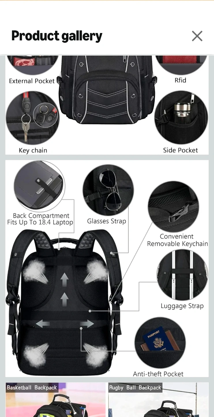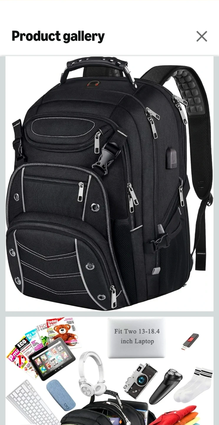 This is a black, 18.4-inch laptop backpack designed for super extra large capacity. It features an external USB port for convenient charging and water-resistant material. The backpack measures 21.3*15.7*11.8 inches and weighs 3.35 pounds.