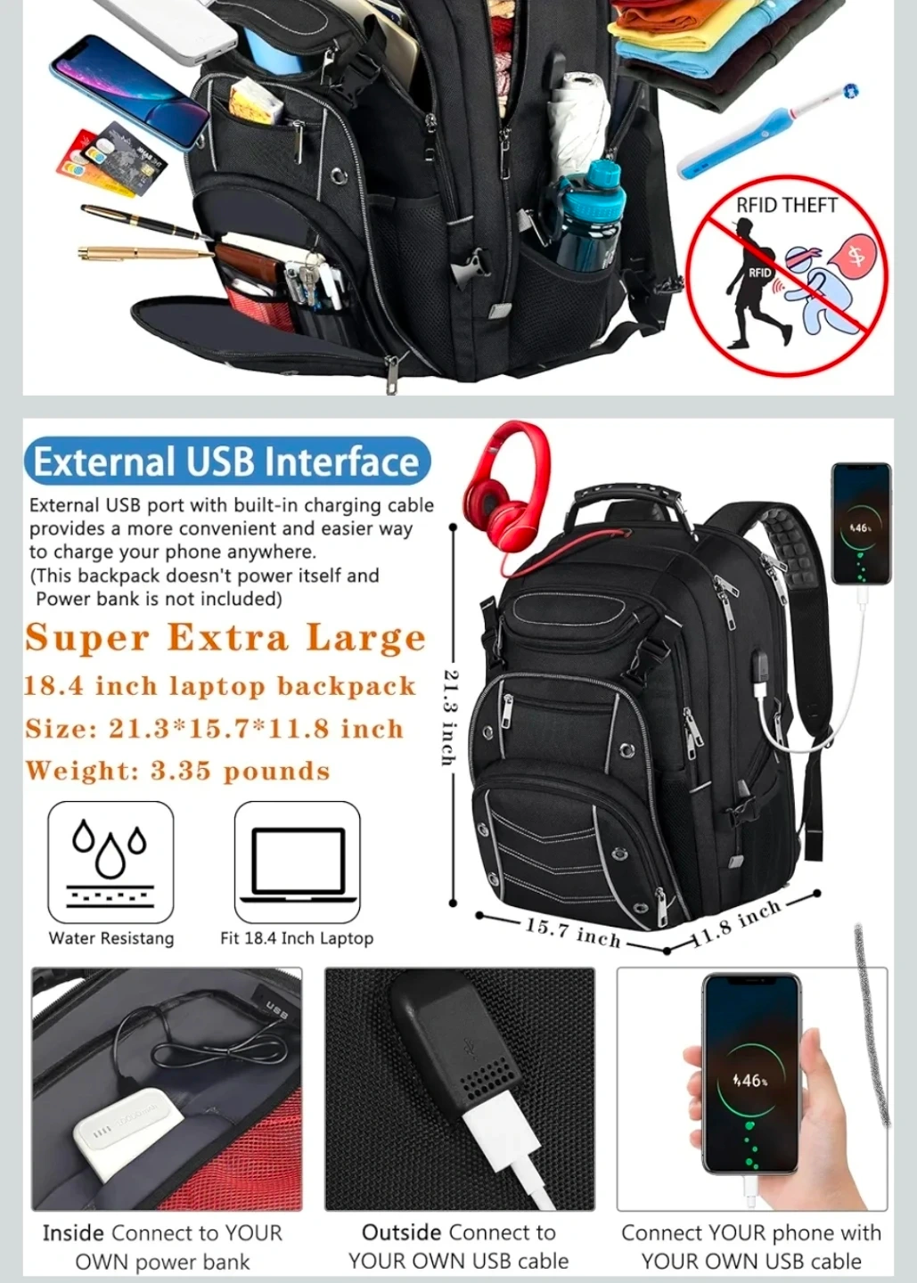This is a black, 18.4-inch laptop backpack designed for super extra large capacity. It features an external USB port for convenient charging and water-resistant material. The backpack measures 21.3*15.7*11.8 inches and weighs 3.35 pounds.