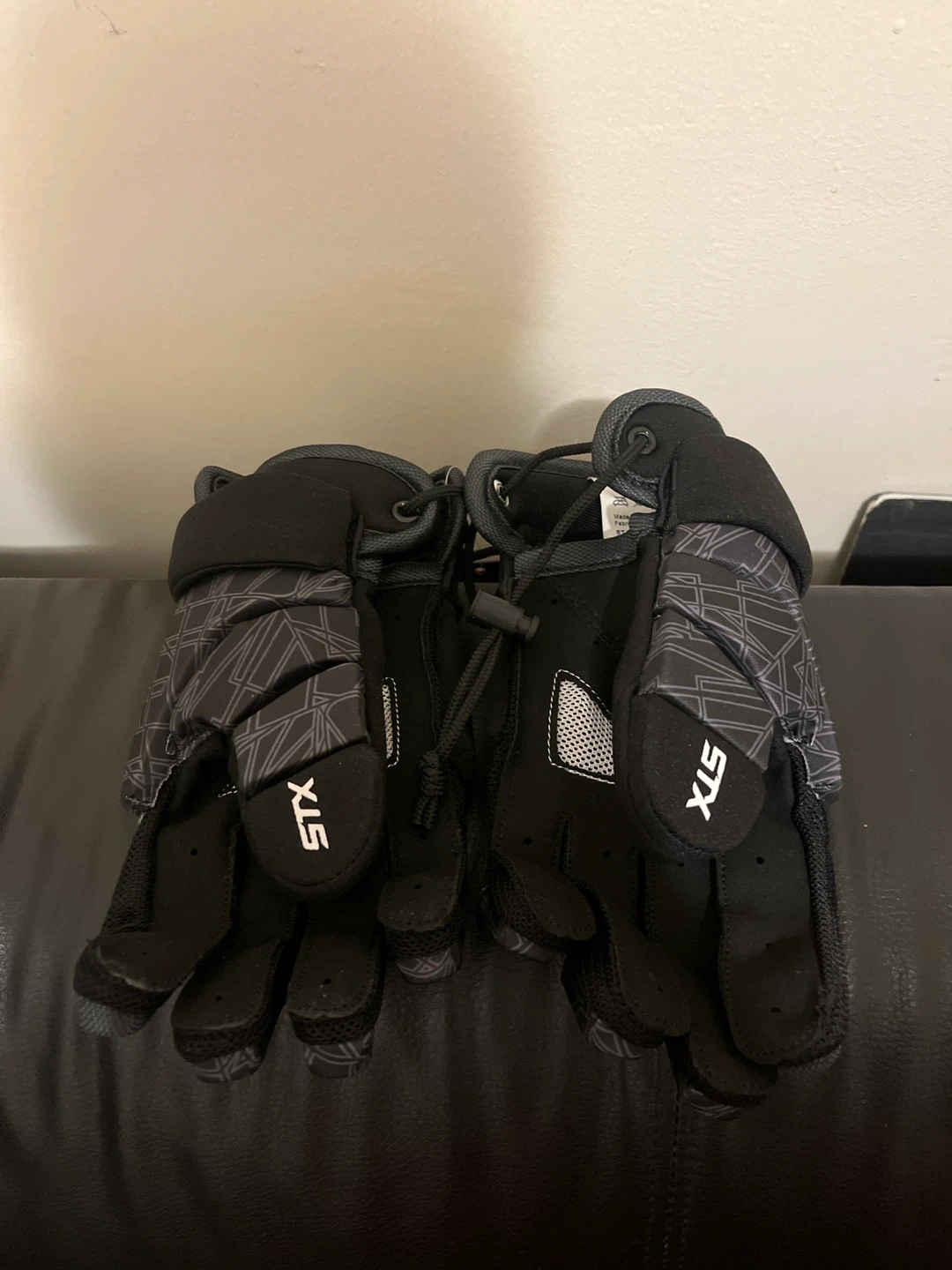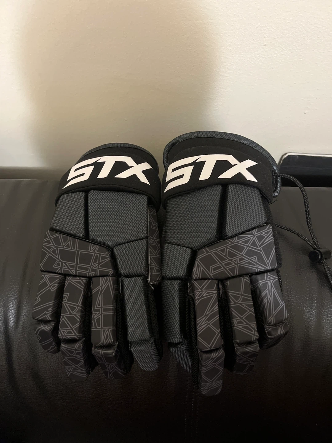 60Selling a pair of STX lacrosse gloves in black. They are in great condition and ready for the field! The gloves feature a unique geometric pattern on the backhand and fingers.