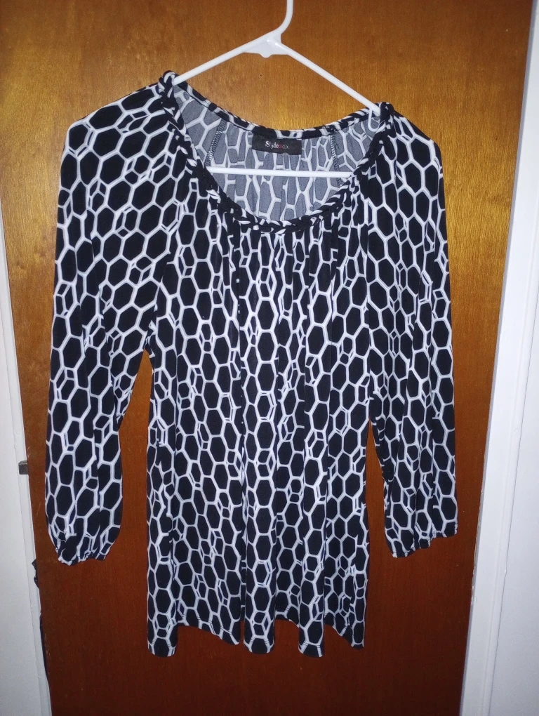 10Here's a stylish blouse from Style&co! It features a unique black and white geometric print. Perfect for adding a touch of flair to your wardrobe