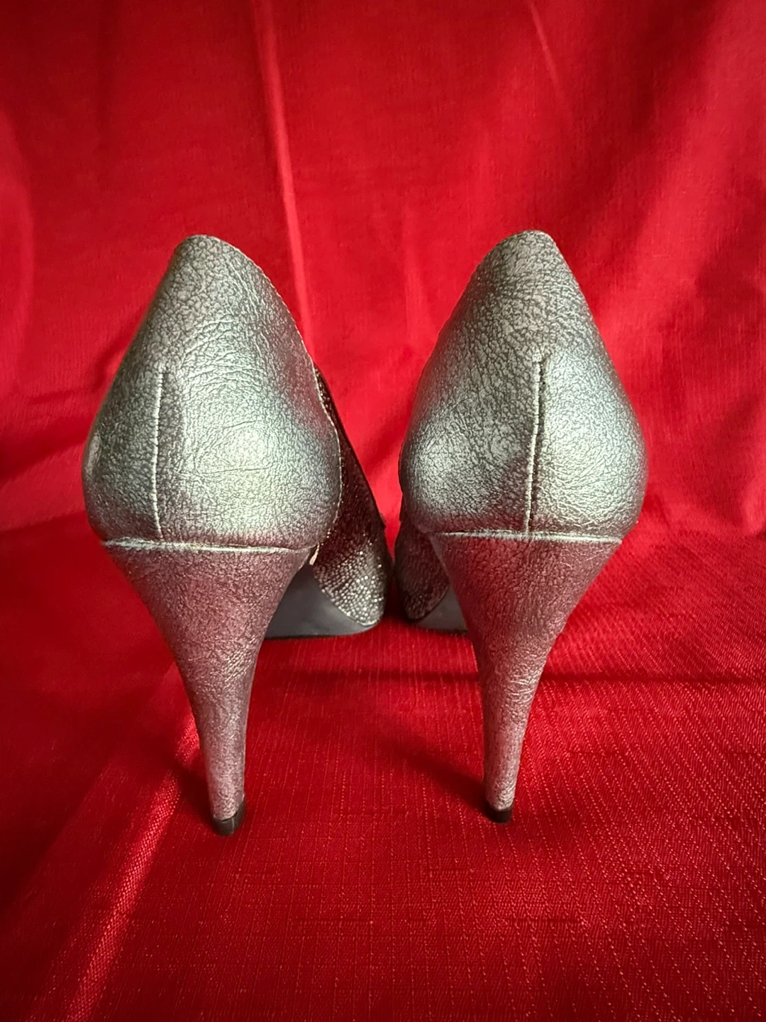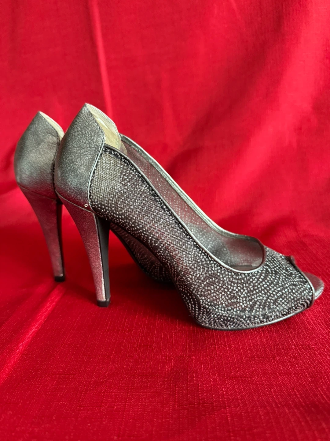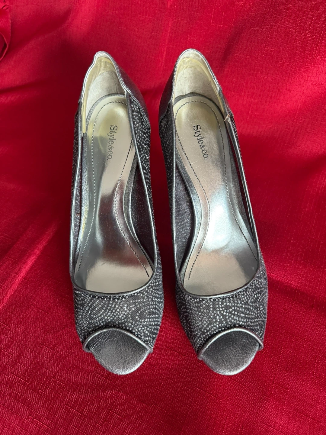 Selling a pair of Style&co. silver heels in size 7. They have a stylish open-toe design and are perfect for dressing up an outfit! They're in great condition and ready for a new home
