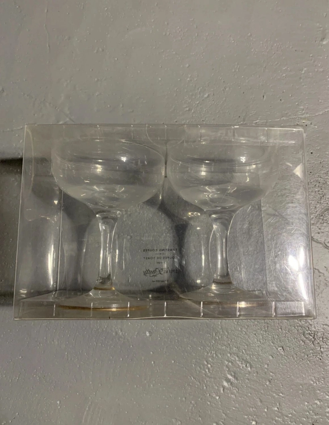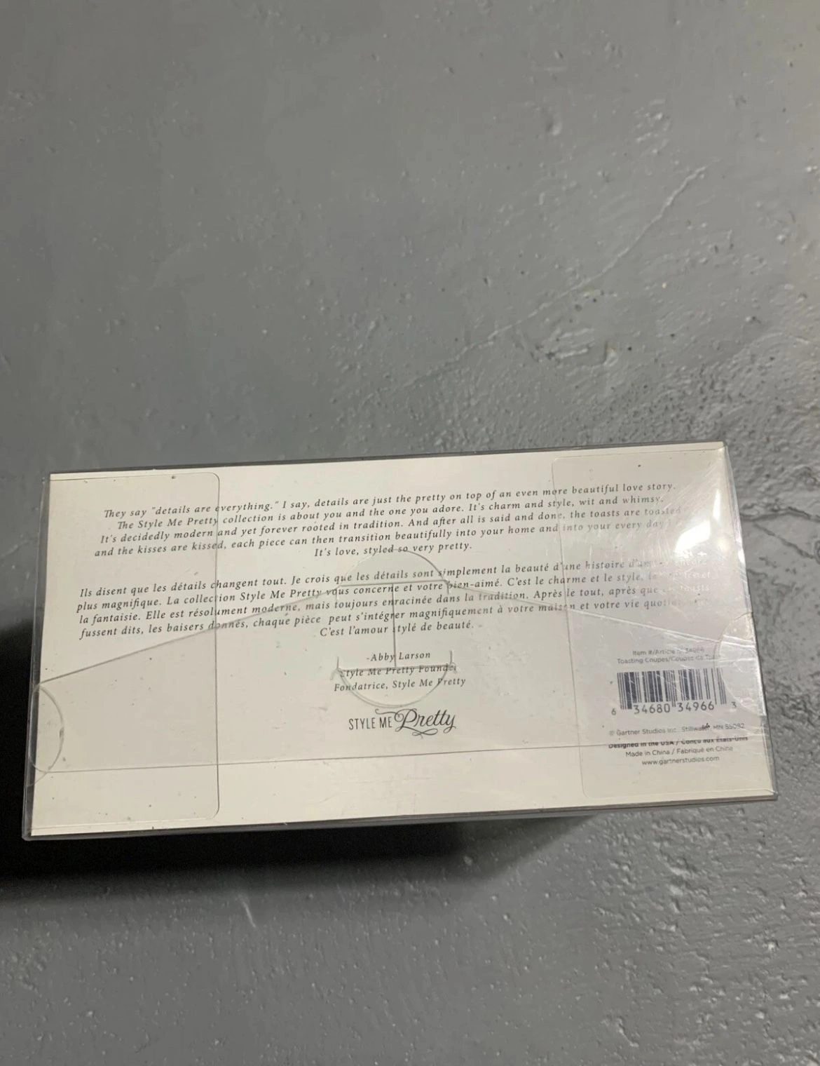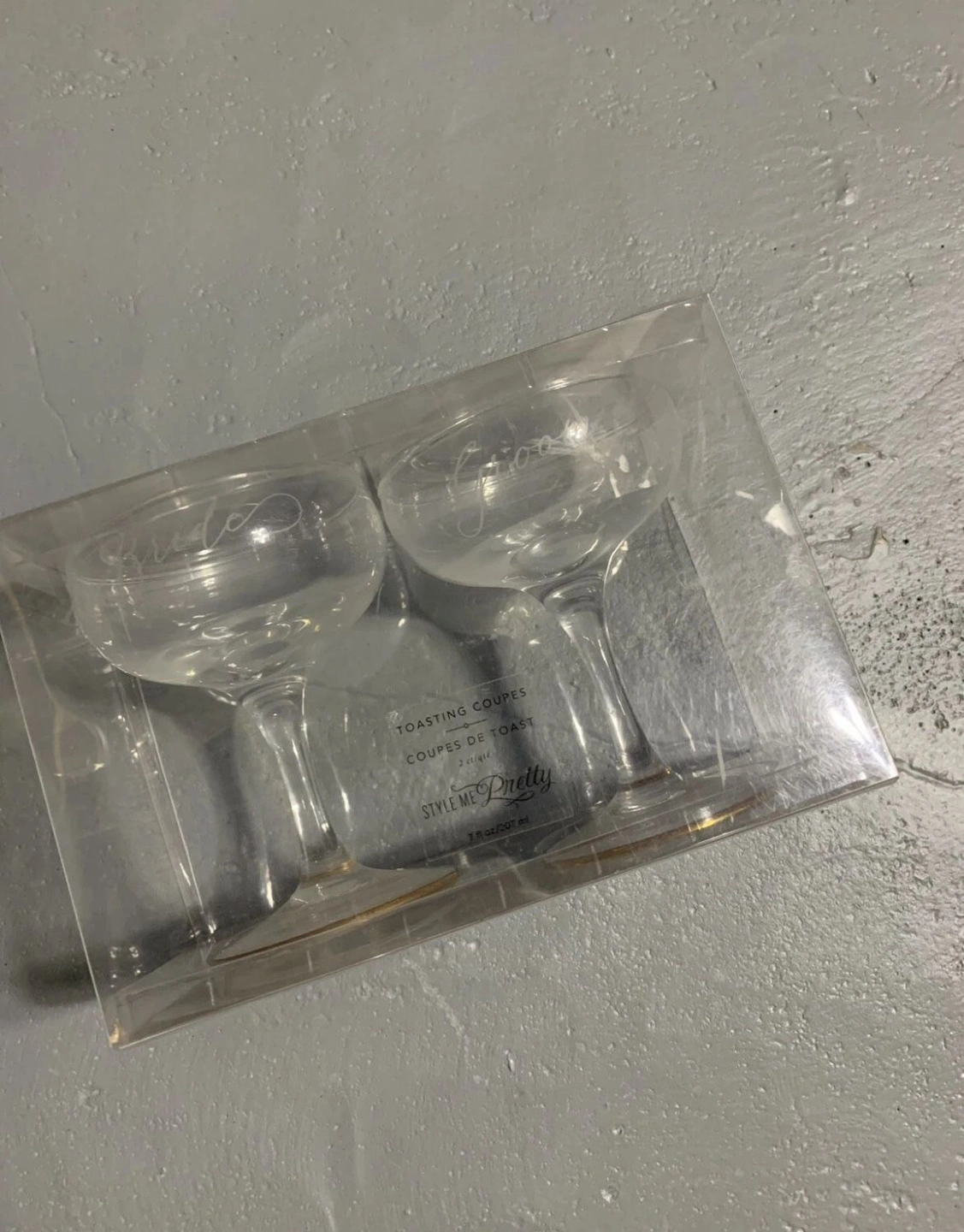 These are new Style Me Pretty Bride & Groom Wedding Champagne Glasses with Gold Trim. It's a little dusty inside but nothing a wash wont take care of. Great for weddings. Color: Clear Type: Wine & Barware Personalized: No