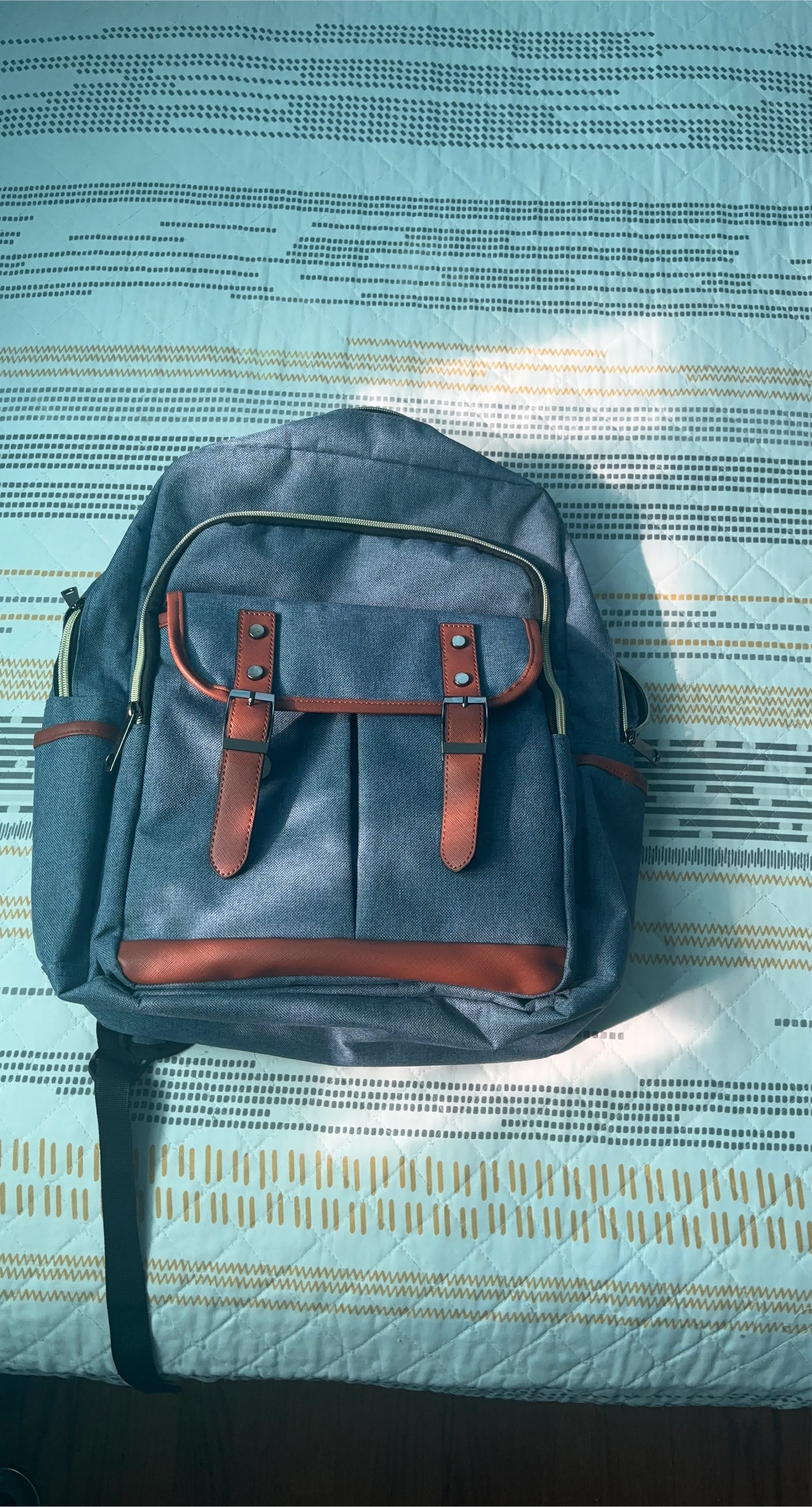 Selling a stylish blue backpack with brown leather-like accents! It features a main compartment with a zipper closure and decorative straps with buckle details on the front. There are also side pockets for extra storage. Perfect for school, work, or travel!
