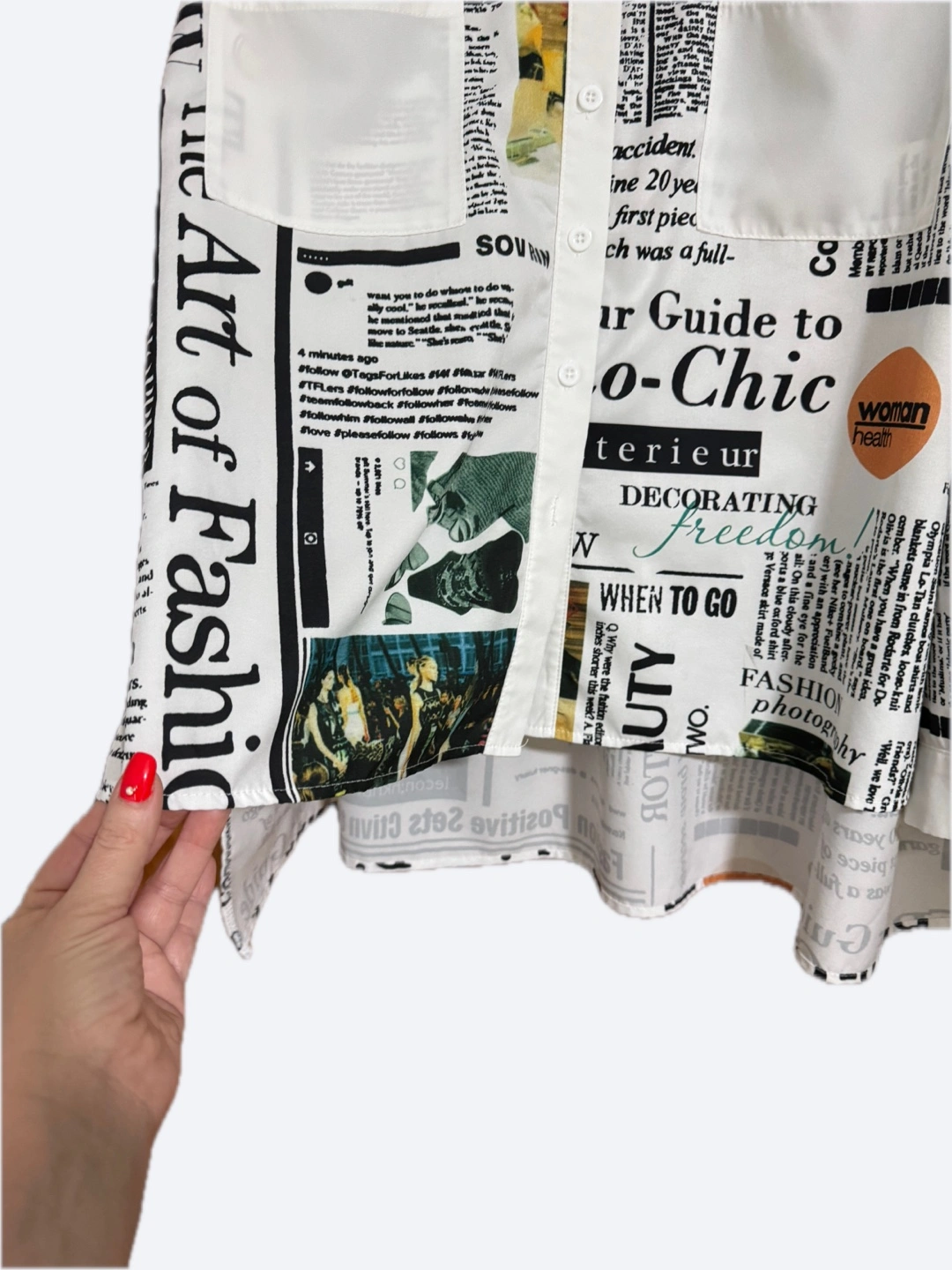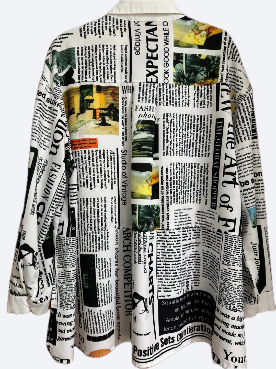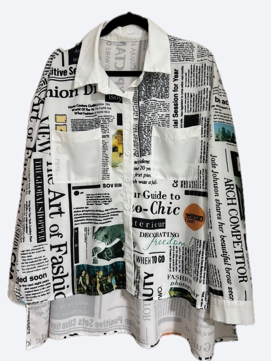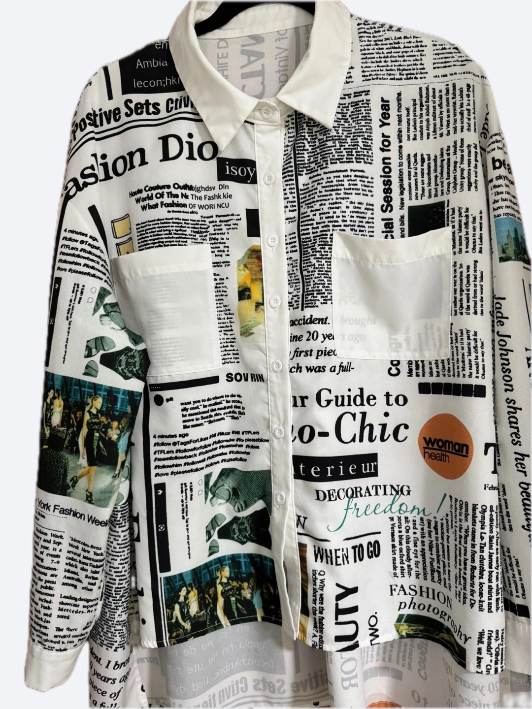 Long sleeve button down shirt. White background with black newspaper print. Relaxed fit. Lightweight material. Chic blouse, size XXL, with a unique newspaper print. Perfect for hiding any tummy or extra weight and also great for pregnancy. Worn only twice, like new. The fabric is wrinkle-free, so you can simply toss it in the wash on a regular cycle and dry as usual—no special care needed. After drying, it looks freshly ironed and neat, perfect for any occasion if this is your style.