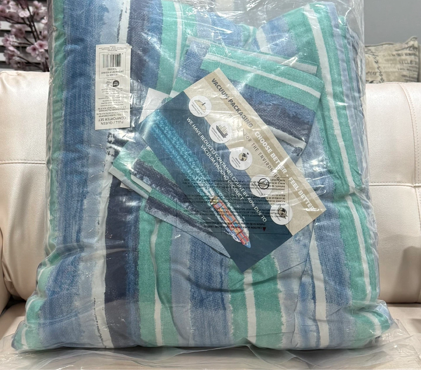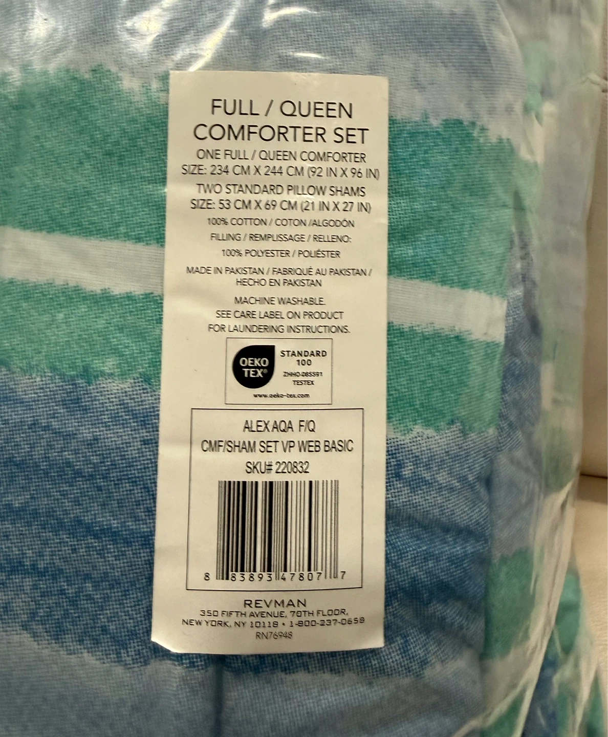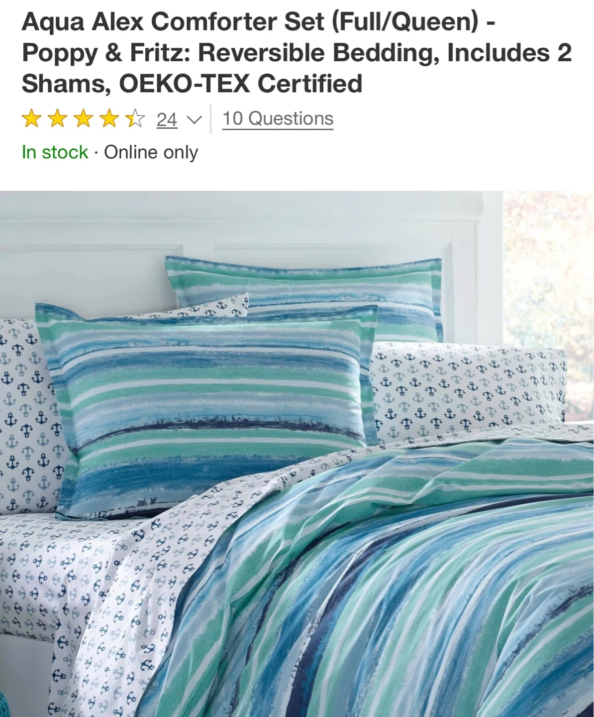 This comforter set features a reversible design with blue and green stripes. It's a Full/Queen size comforter and includes 2 shams. The bedding is Oeko-Tex certified.