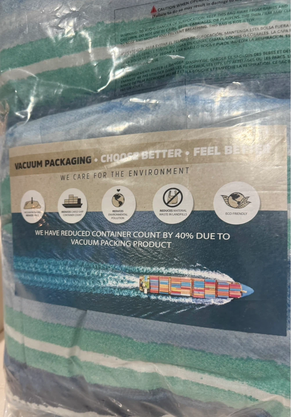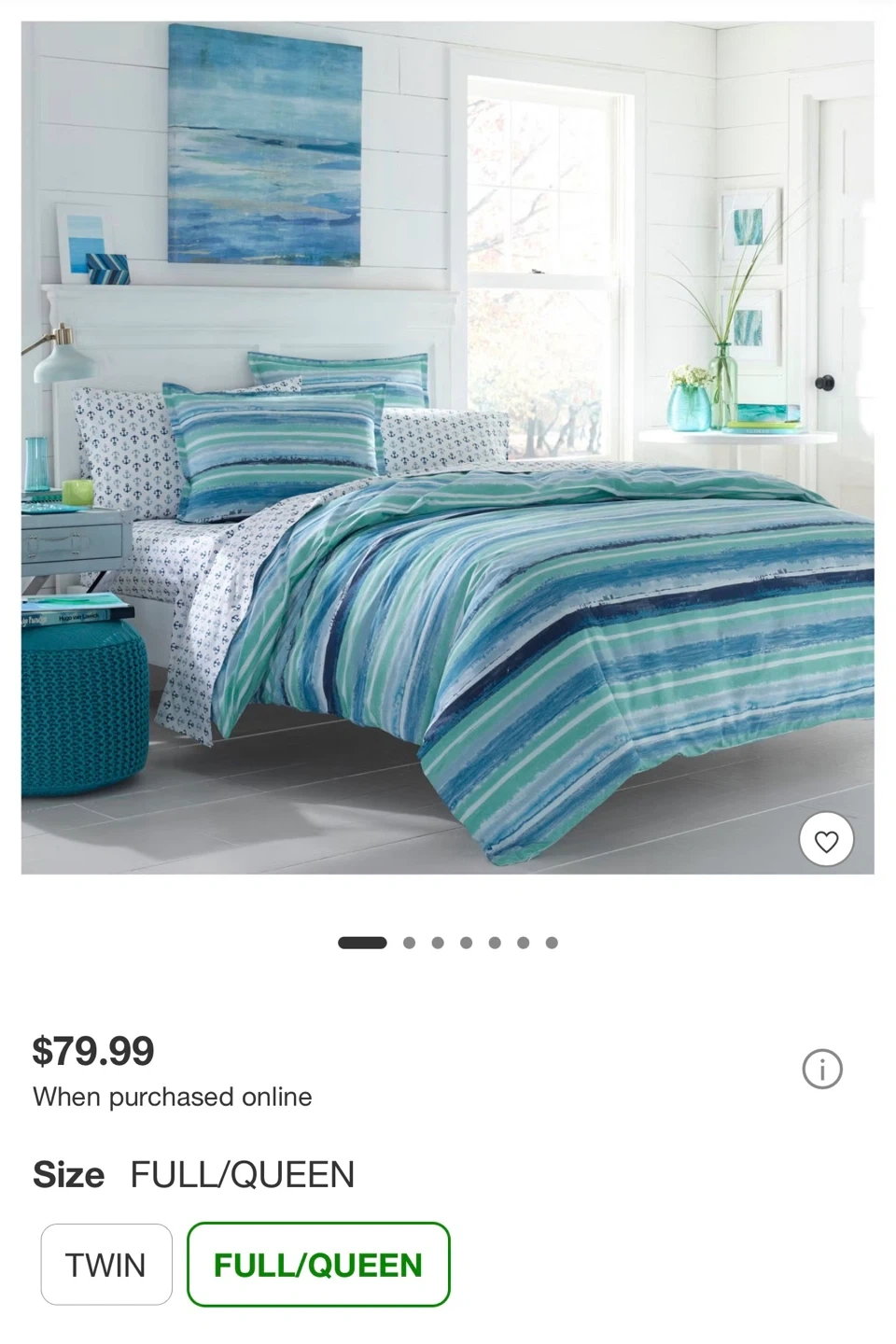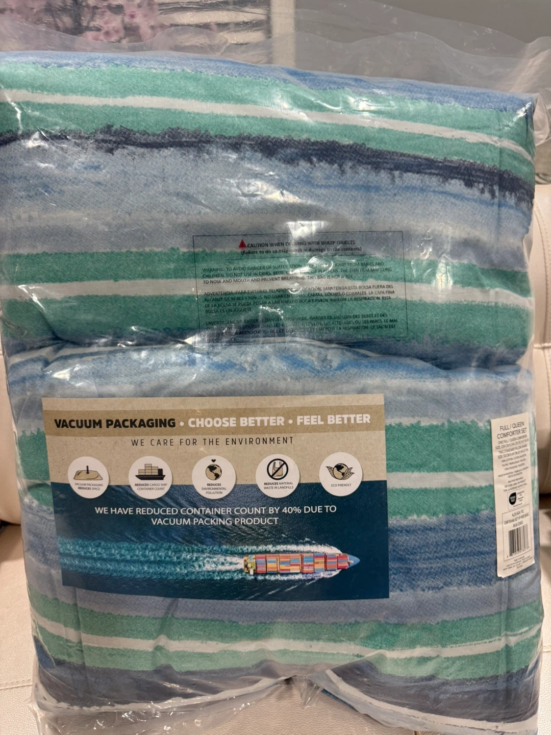 This comforter set features a reversible design with blue and green stripes. It's a Full/Queen size comforter and includes 2 shams. The bedding is Oeko-Tex certified.