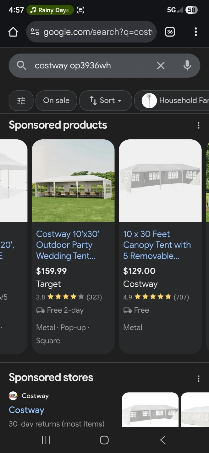 Selling a Costway 10'x30' Outdoor Party Wedding Tent. It's made of metal and has a pop-up square design. Includes all the necessary components and comes in the original box