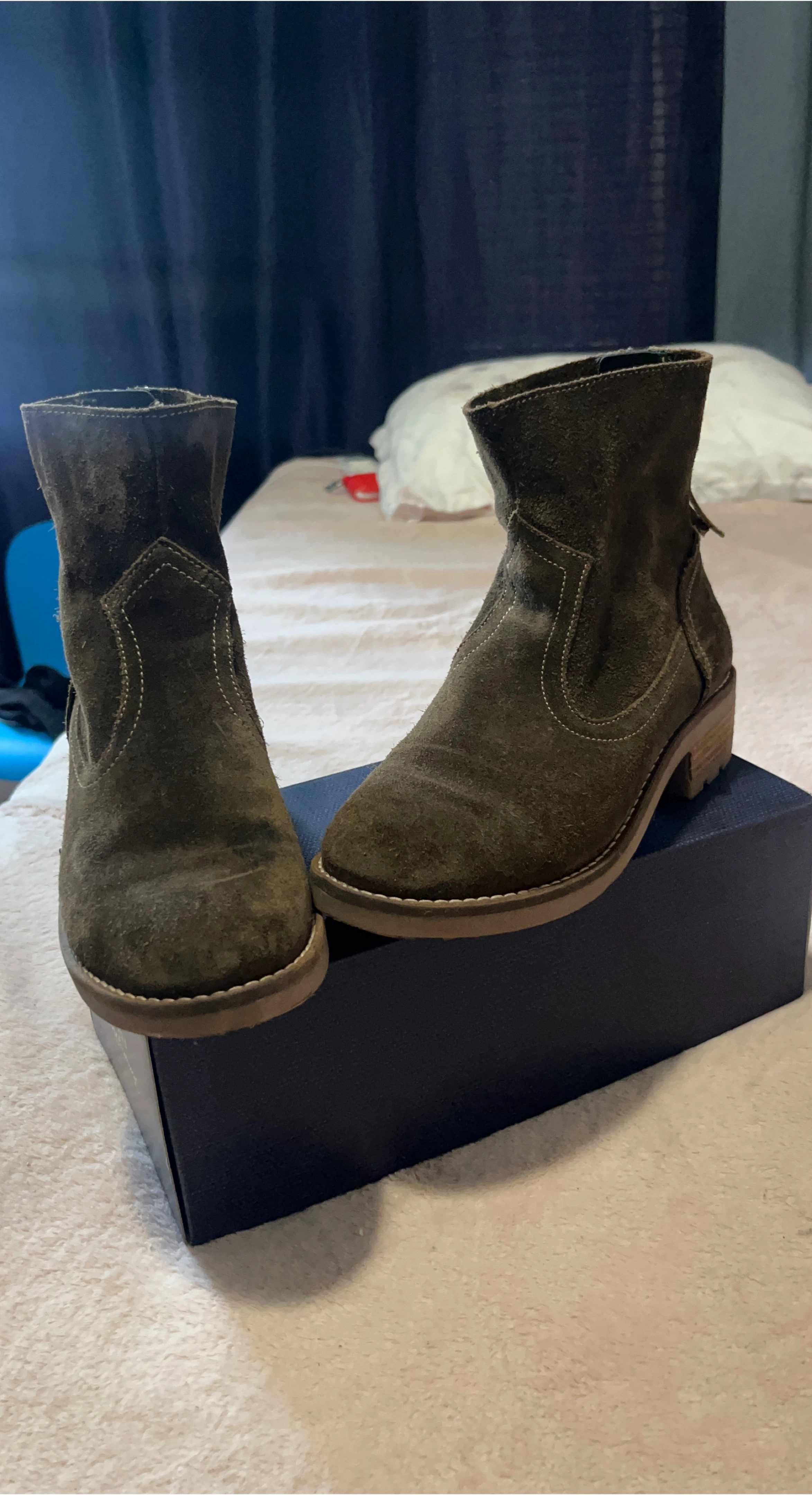 Selling a pair of suede ankle boots. They have a stylish look and are in good condition.