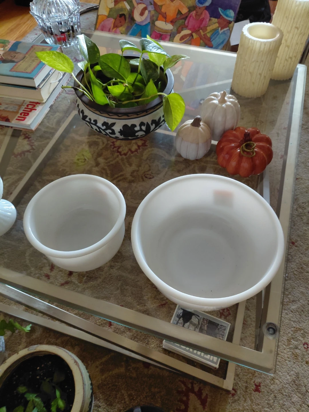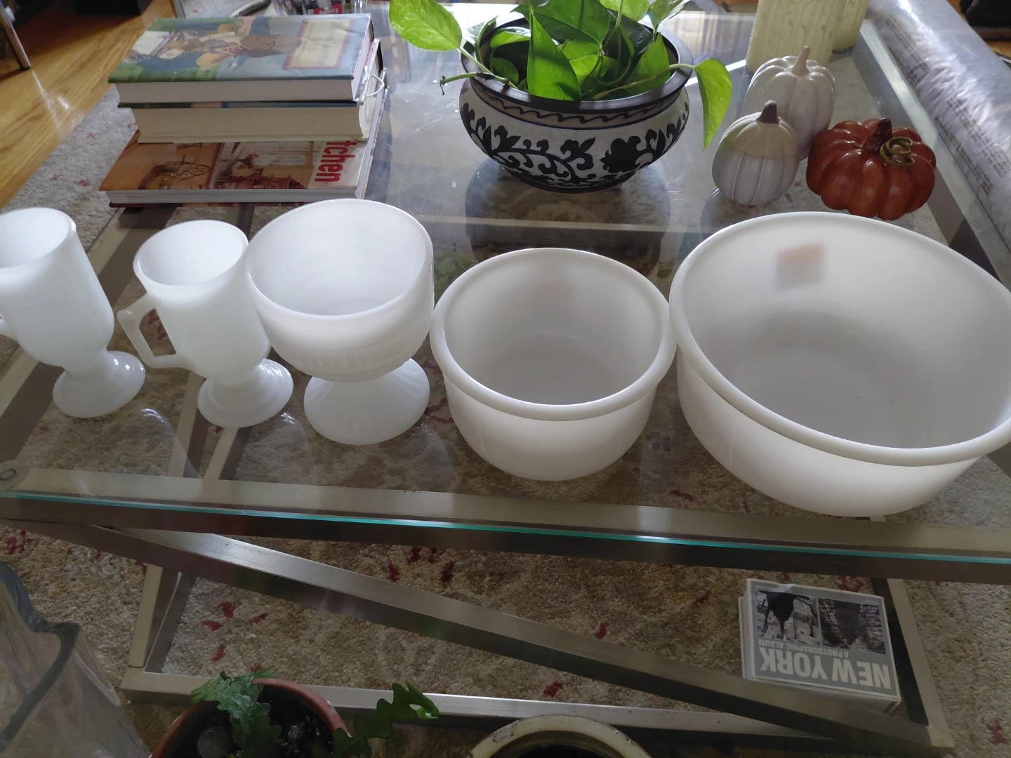 Selling a collection of vintage milk glass items! There are bowls and mugs in this set. Perfect for adding a touch of retro charm to your kitchen or collection