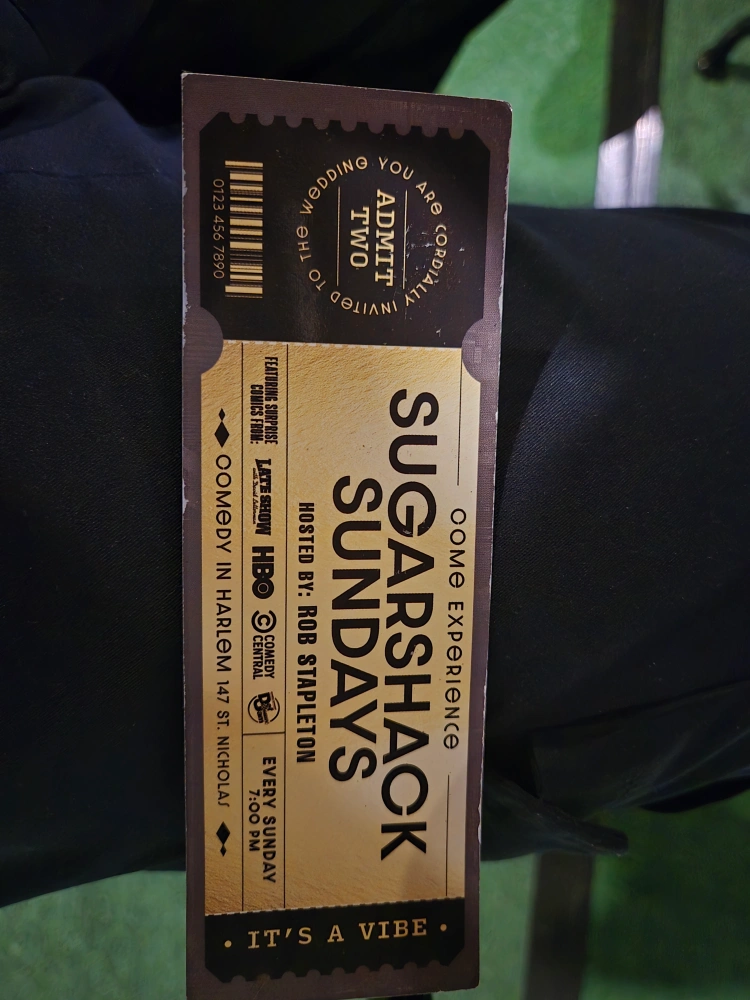 I have a ticket for the Sugarshack Sundays comedy show. It's hosted by Rob Stapleton and features surprise comics from HBO and Comedy Central. The show is in Harlem at 147 St. Nicholas Ave and starts at 7:00 PM every Sunday. Please note that complimentary tickets are valid only before 7:00 PM and seating is very limited