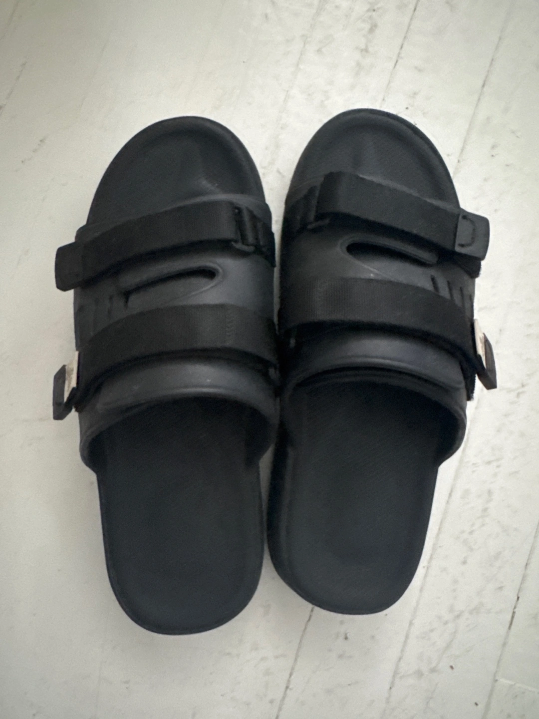 Selling a pair of Suicoke slides in black. They feature adjustable straps for a comfortable fit. There are signs of wear on the soles, as shown in the pictures, but the slides are still in good condition for everyday use
