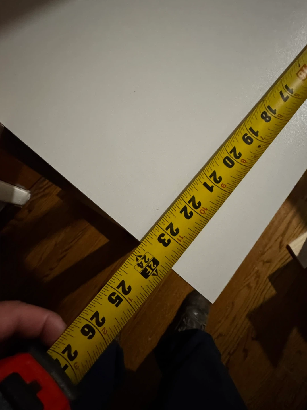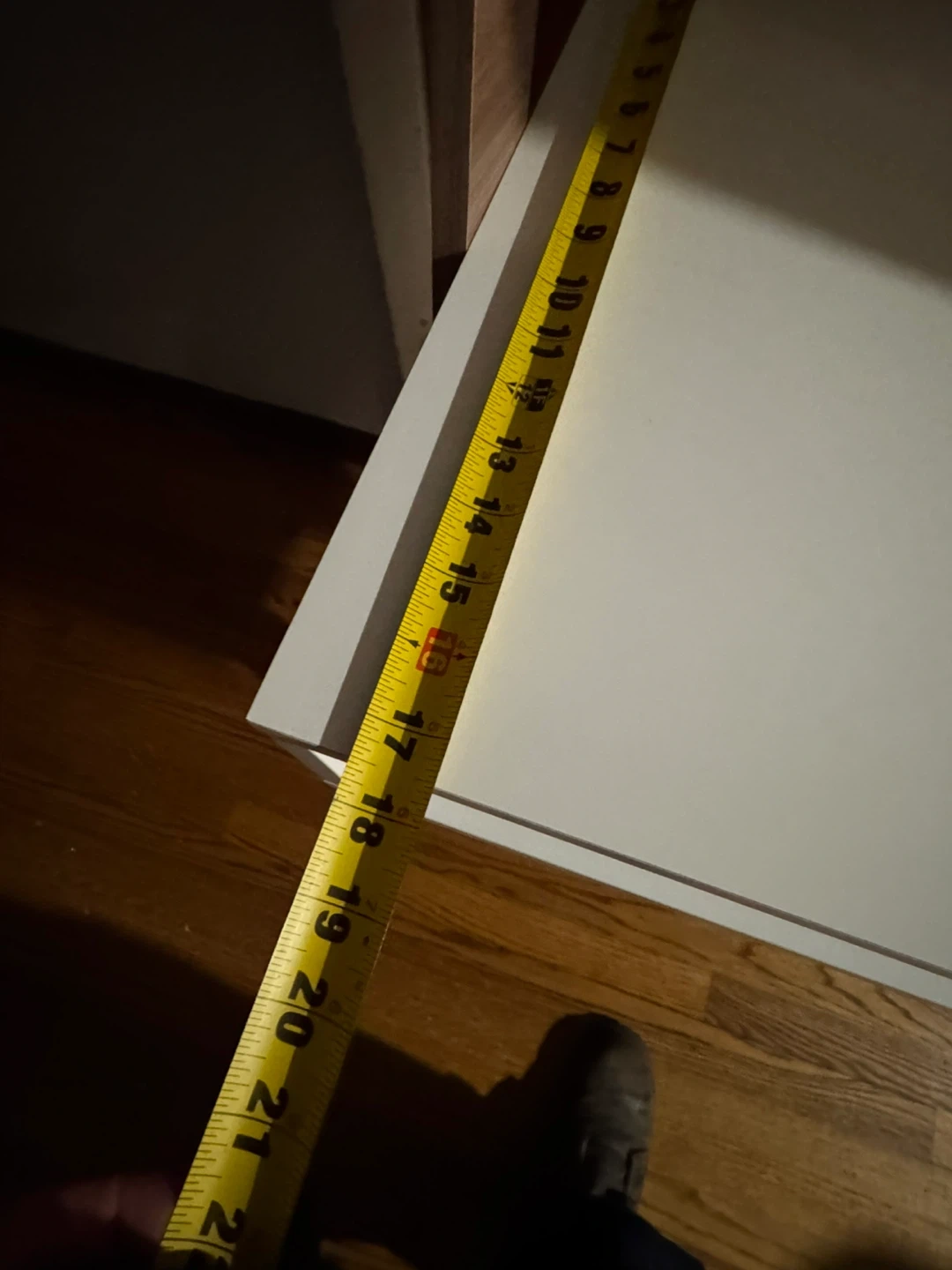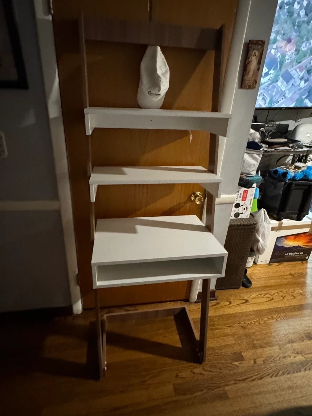 This ladder shelf features a built-in desk, perfect for small spaces! The shelves are white, and the frame is a wood-look brown. The desk surface measures approximately 26 inches wide and 21 inches deep, and the whole unit stands about 72 inches tall