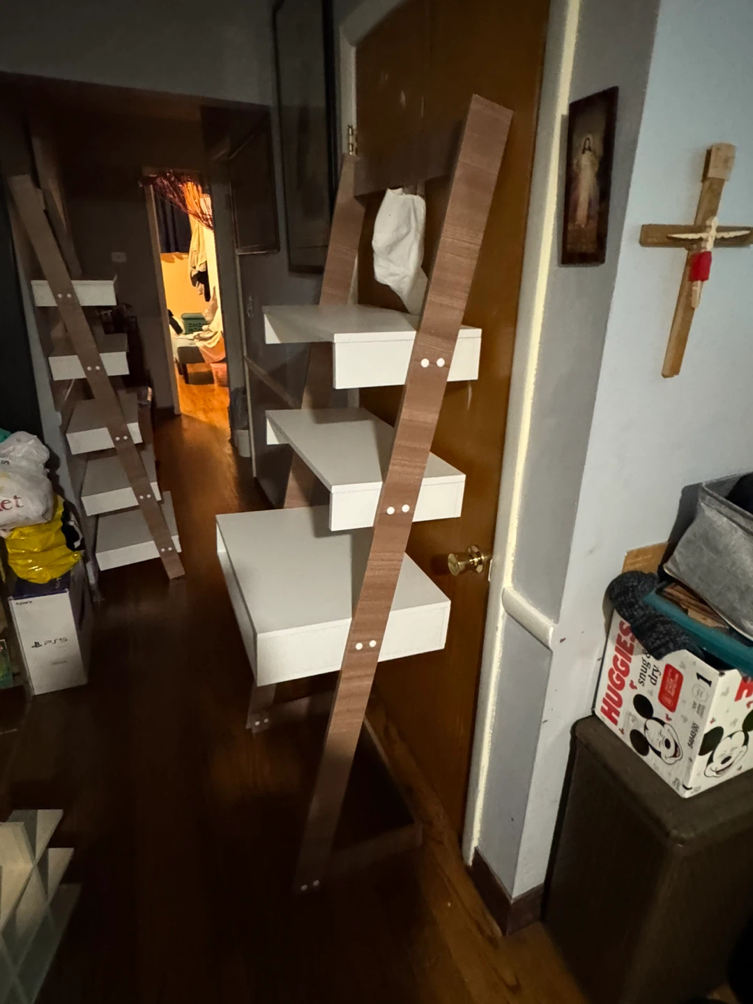 This ladder shelf features a built-in desk, perfect for small spaces! The shelves are white, and the frame is a wood-look brown. The desk surface measures approximately 26 inches wide and 21 inches deep, and the whole unit stands about 72 inches tall