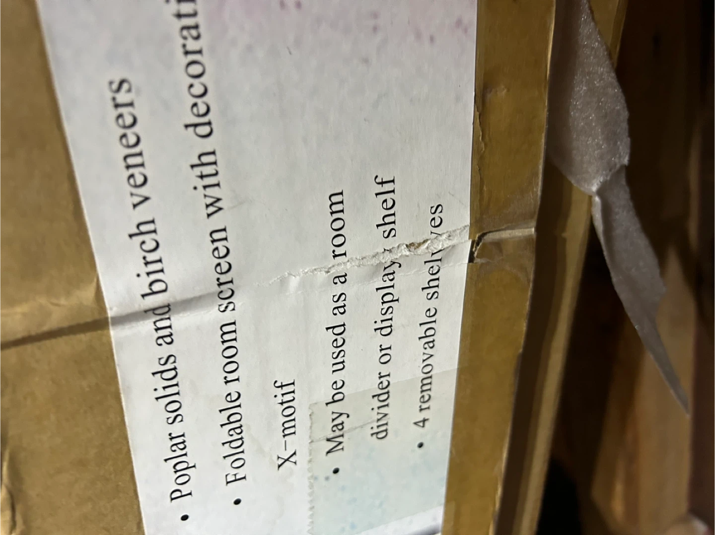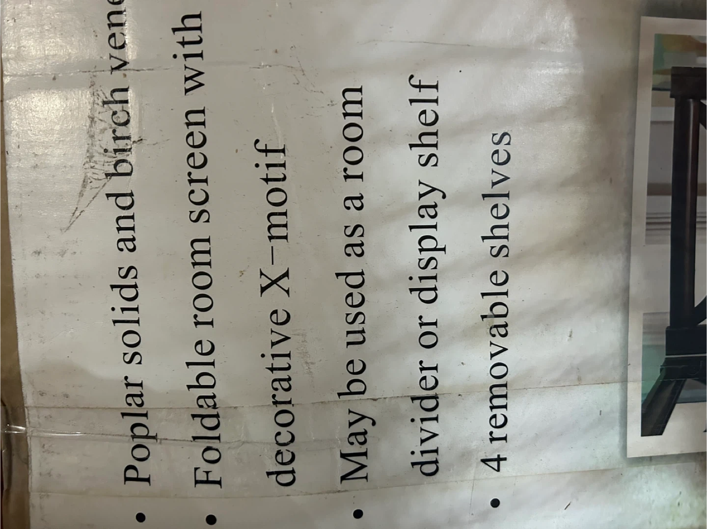 10Selling a Sullivan Loom Divider, which can be used as a room divider or display shelf. It features a foldable room screen with a decorative X-motif and 4 removable shelves. It is made of poplar solids and birch veneers