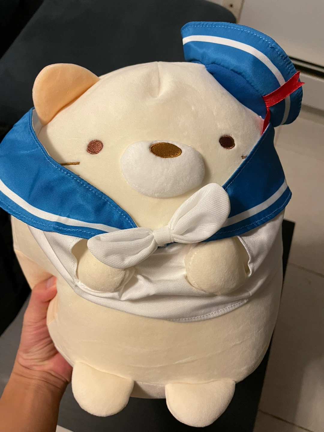 This is a cute Sumikko Gurashi plush toy! It features a bear dressed in a sailor outfit. It's in great condition and ready for a new home