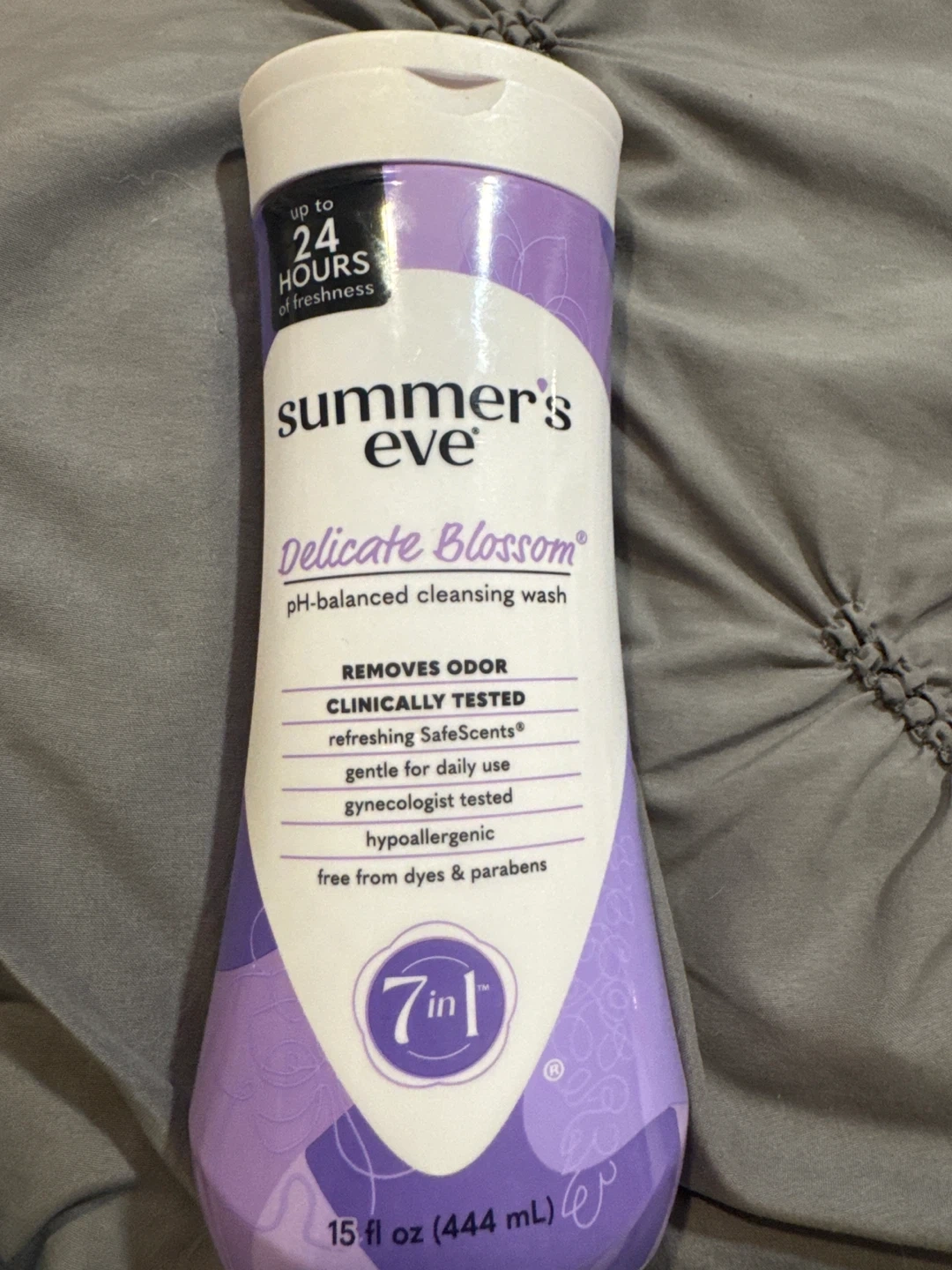 Selling a bottle of Summer's Eve Delicate Blossom pH-balanced cleansing wash. It removes odor and is clinically tested. It's also hypoallergenic and free from dyes and parabens, making it gentle for daily use