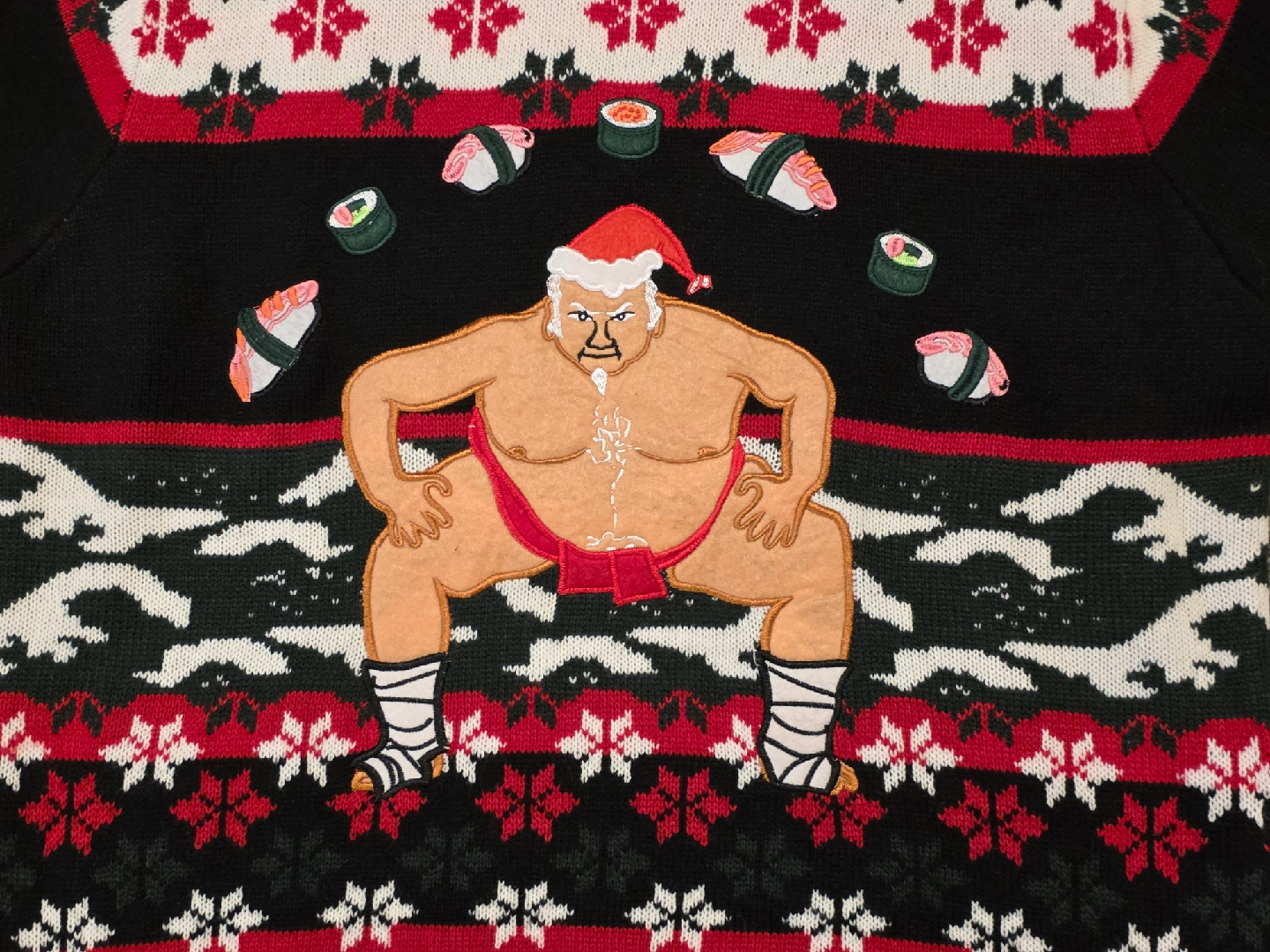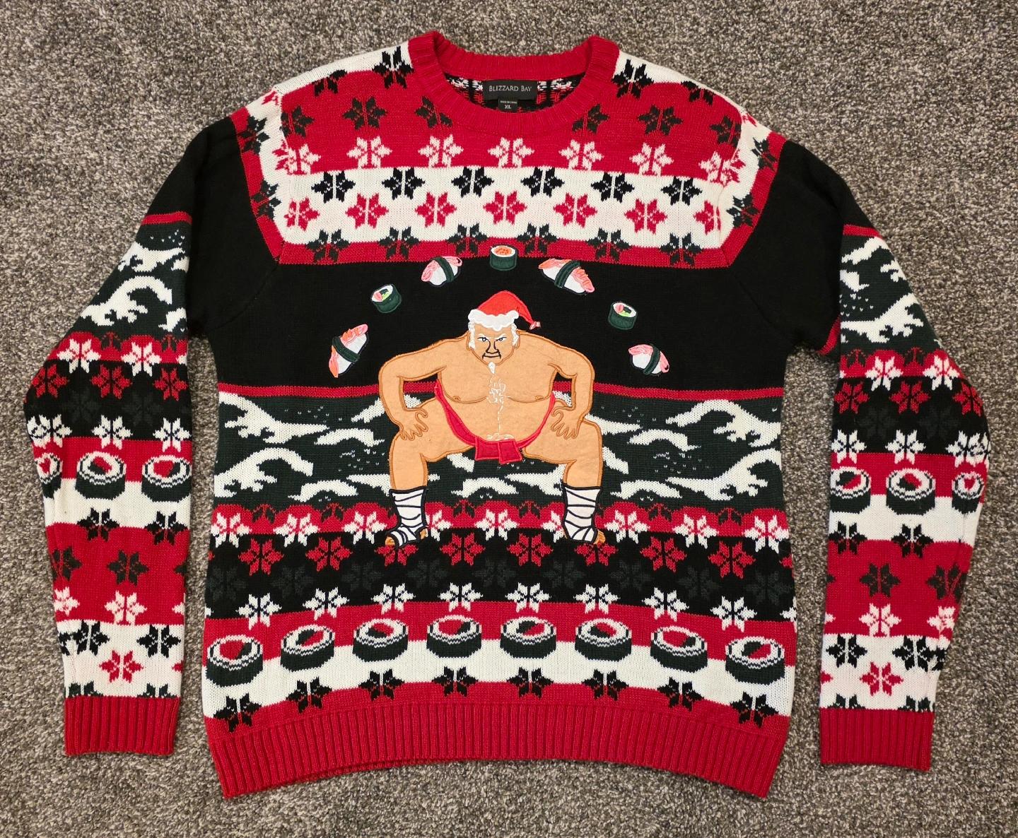 60Selling a Blizzard Bay ugly Christmas sweater in size XL. It features a sumo wrestler and sushi design with a festive Christmas theme. Perfect for your next holiday party! Pick up in Naperville near naper blvd and 87th street or near downtown Naperville off of Chicago and Charles