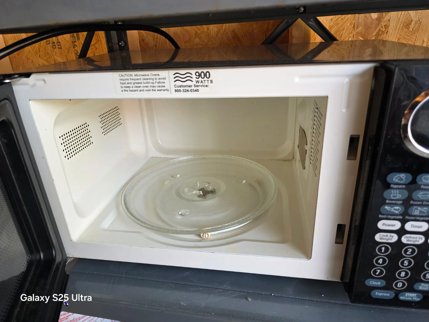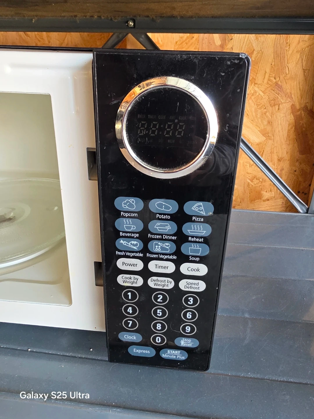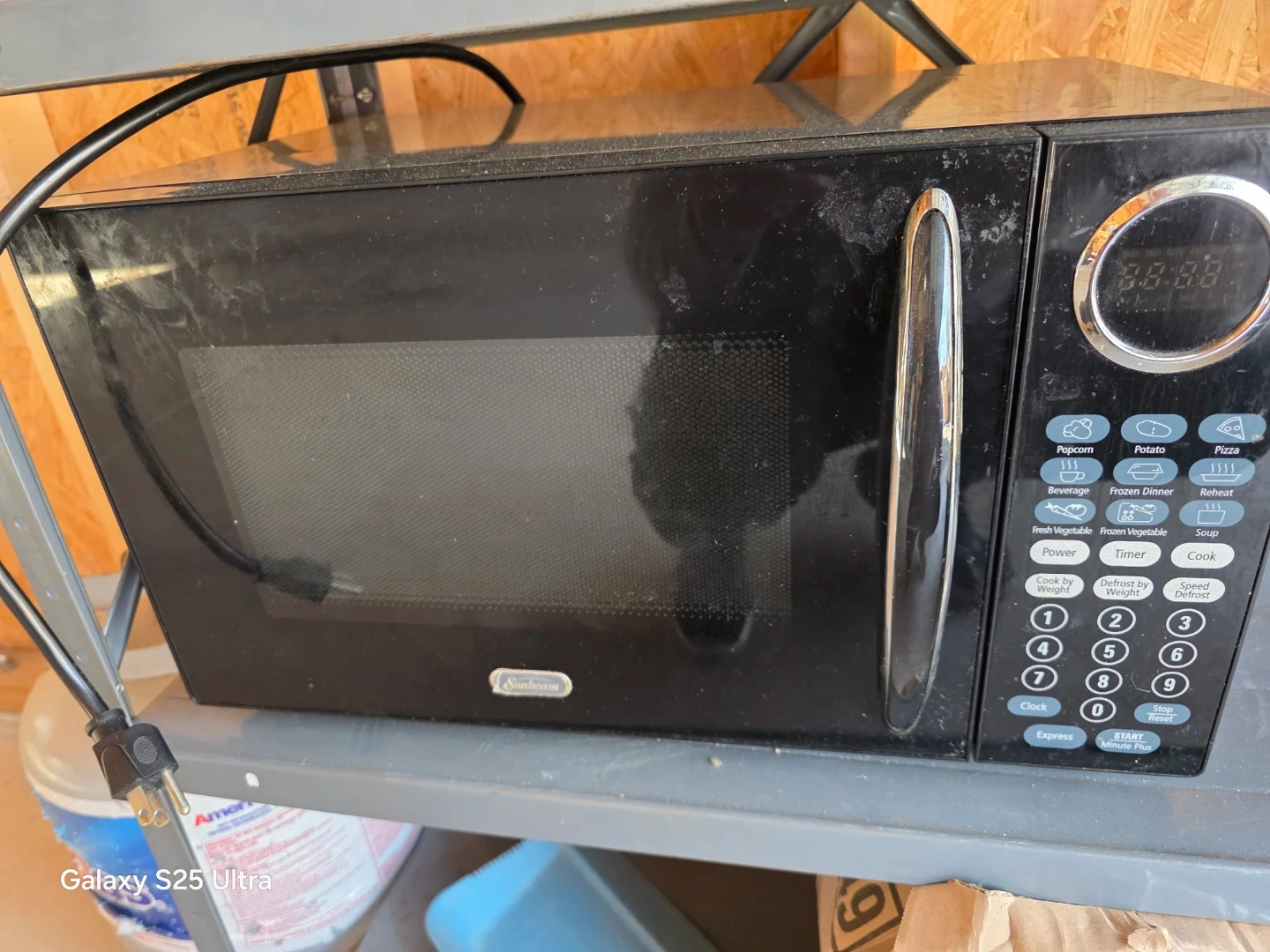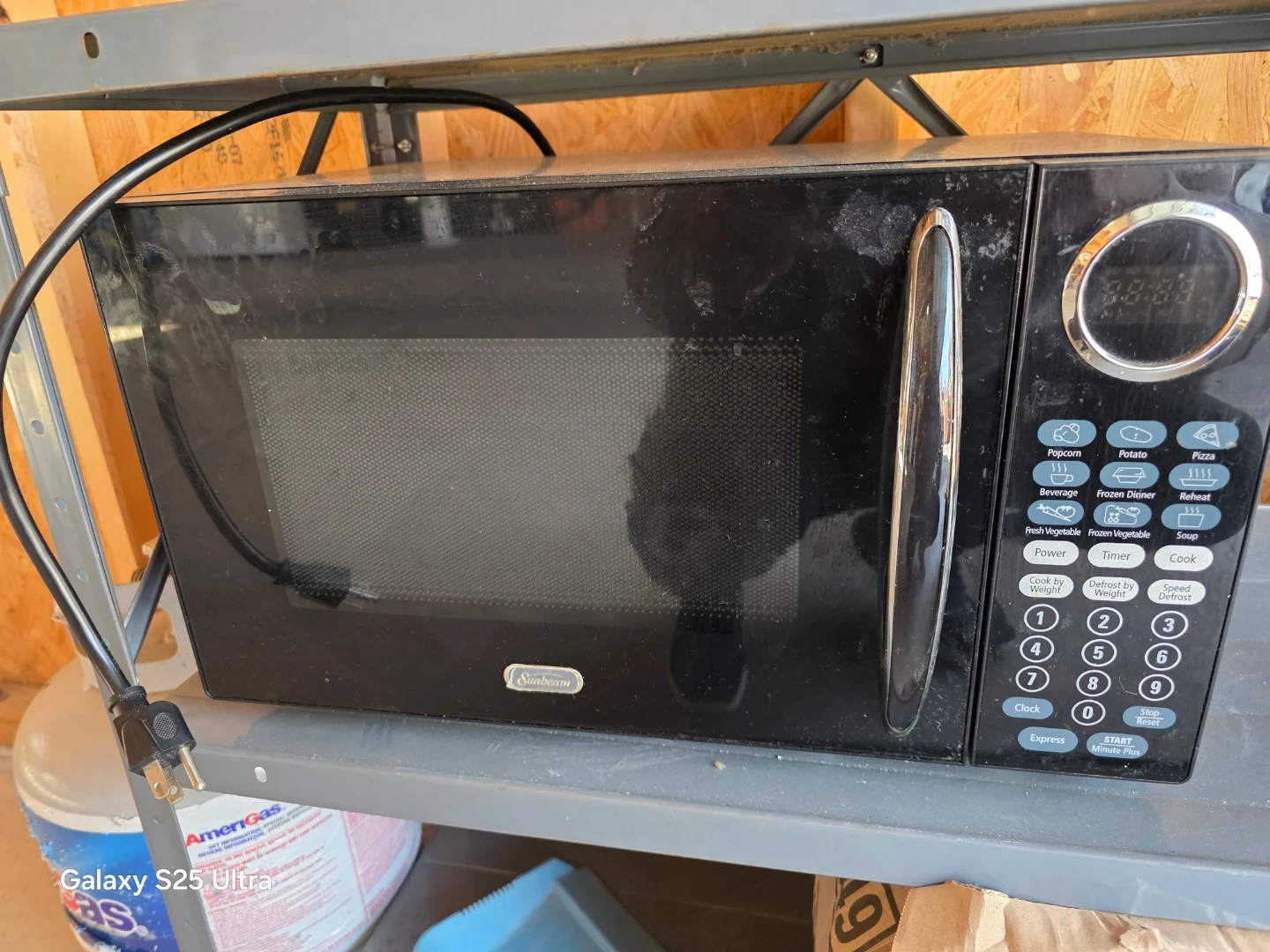 75Selling a Sunbeam microwave oven, 900 watts. It has some signs of use but is still functional. Features include settings for popcorn, potato, pizza, beverage, frozen dinner, reheat, fresh vegetable, frozen vegetable, and soup