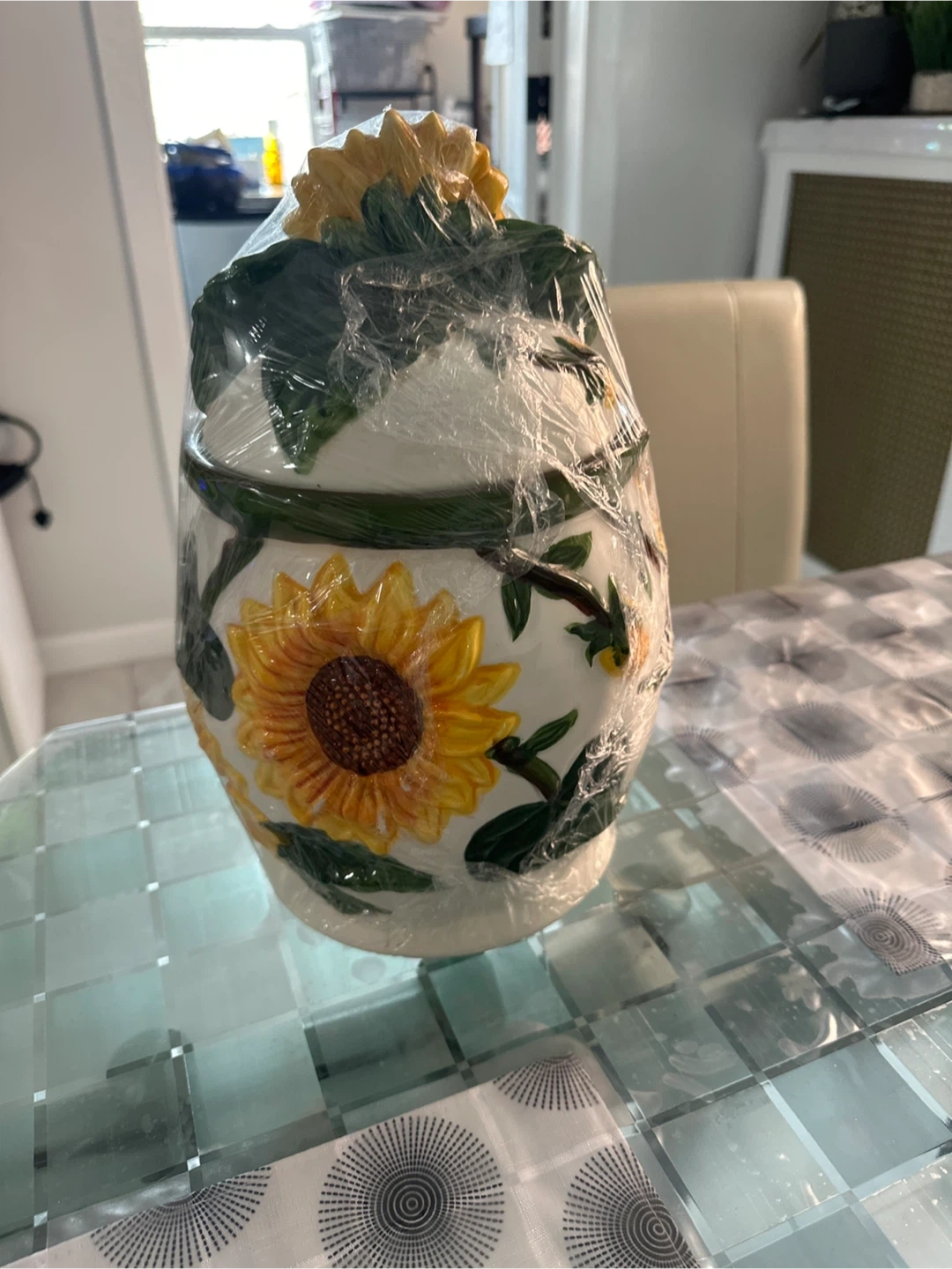 Here's a lovely sunflower cookie jar! It's in great condition and ready to brighten up your kitchen