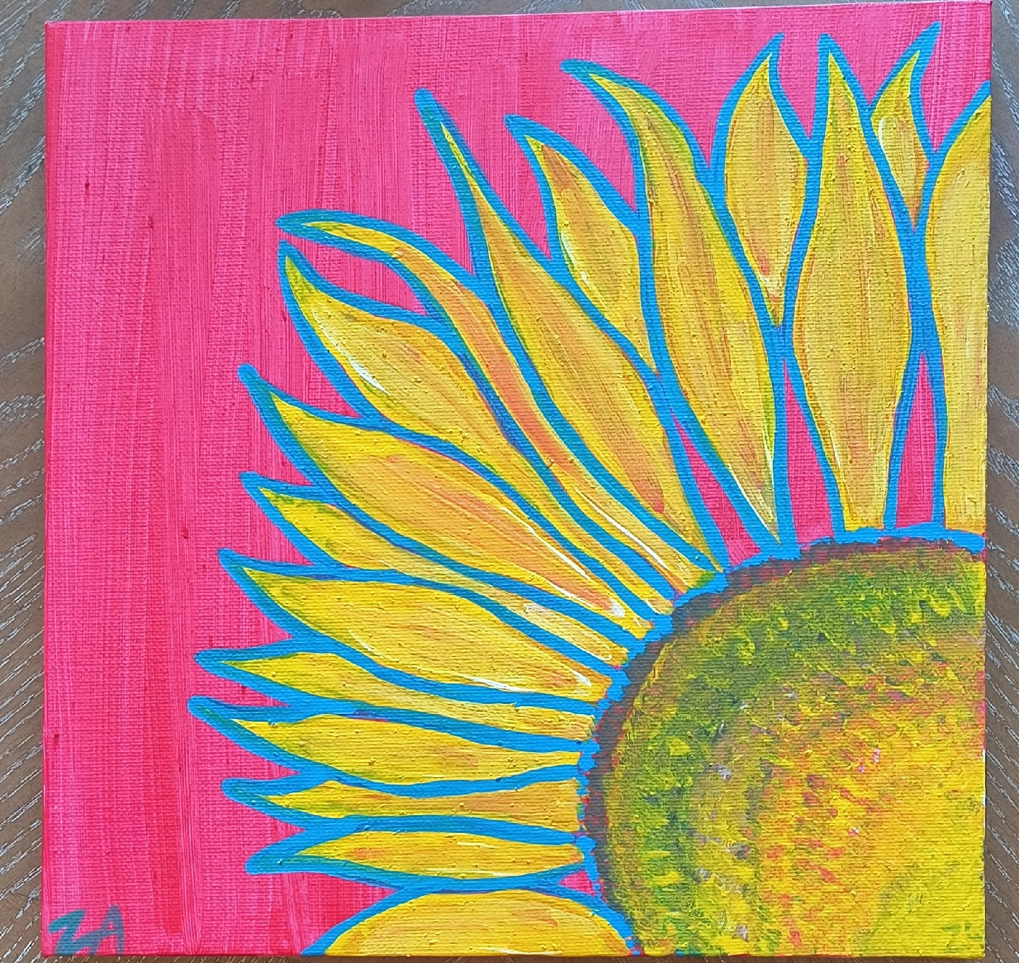 65This is a vibrant painting of a sunflower with a pink background. The sunflower has yellow petals outlined in blue, and a green center. It's a colorful piece of art that would brighten up any room
