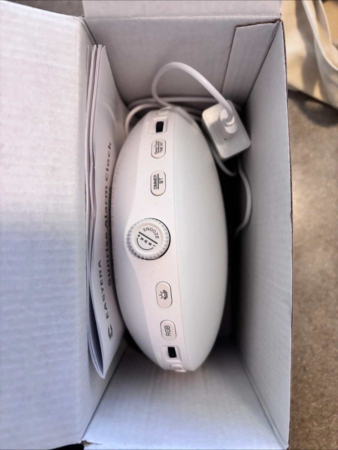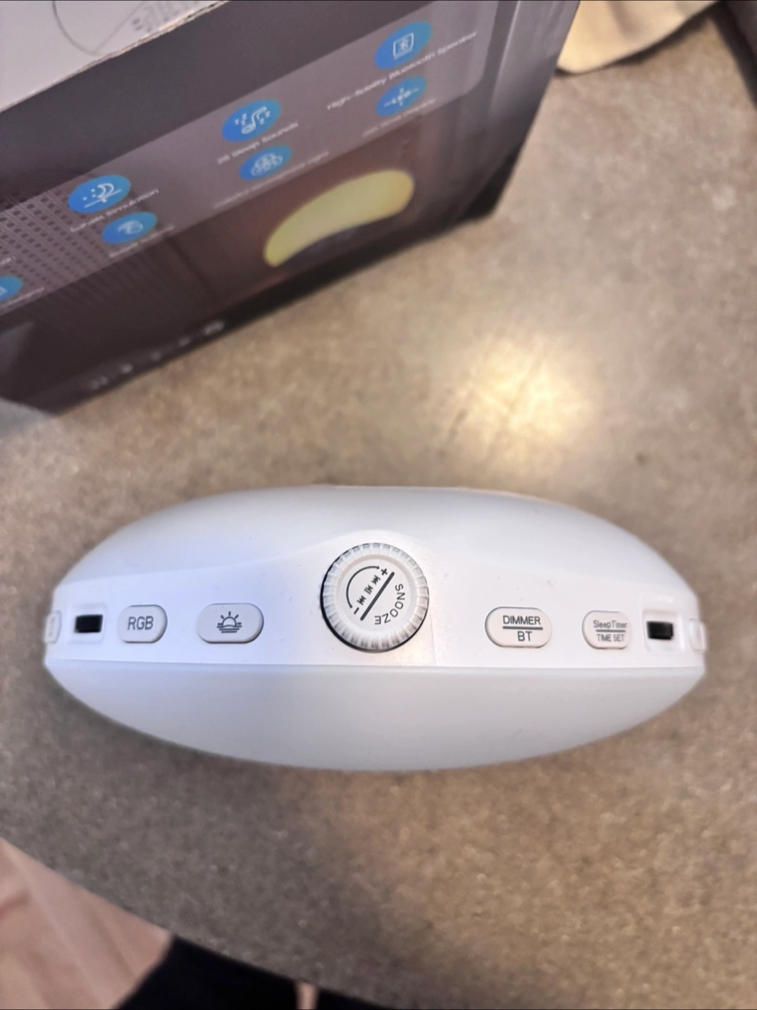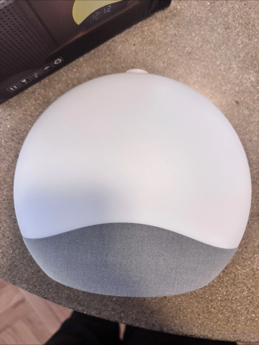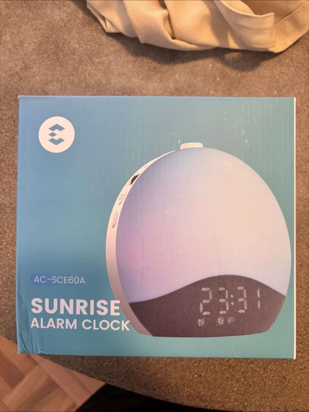 21Alarm clock, white. Features a snooze button and RGB. Great for starting the day gently.
