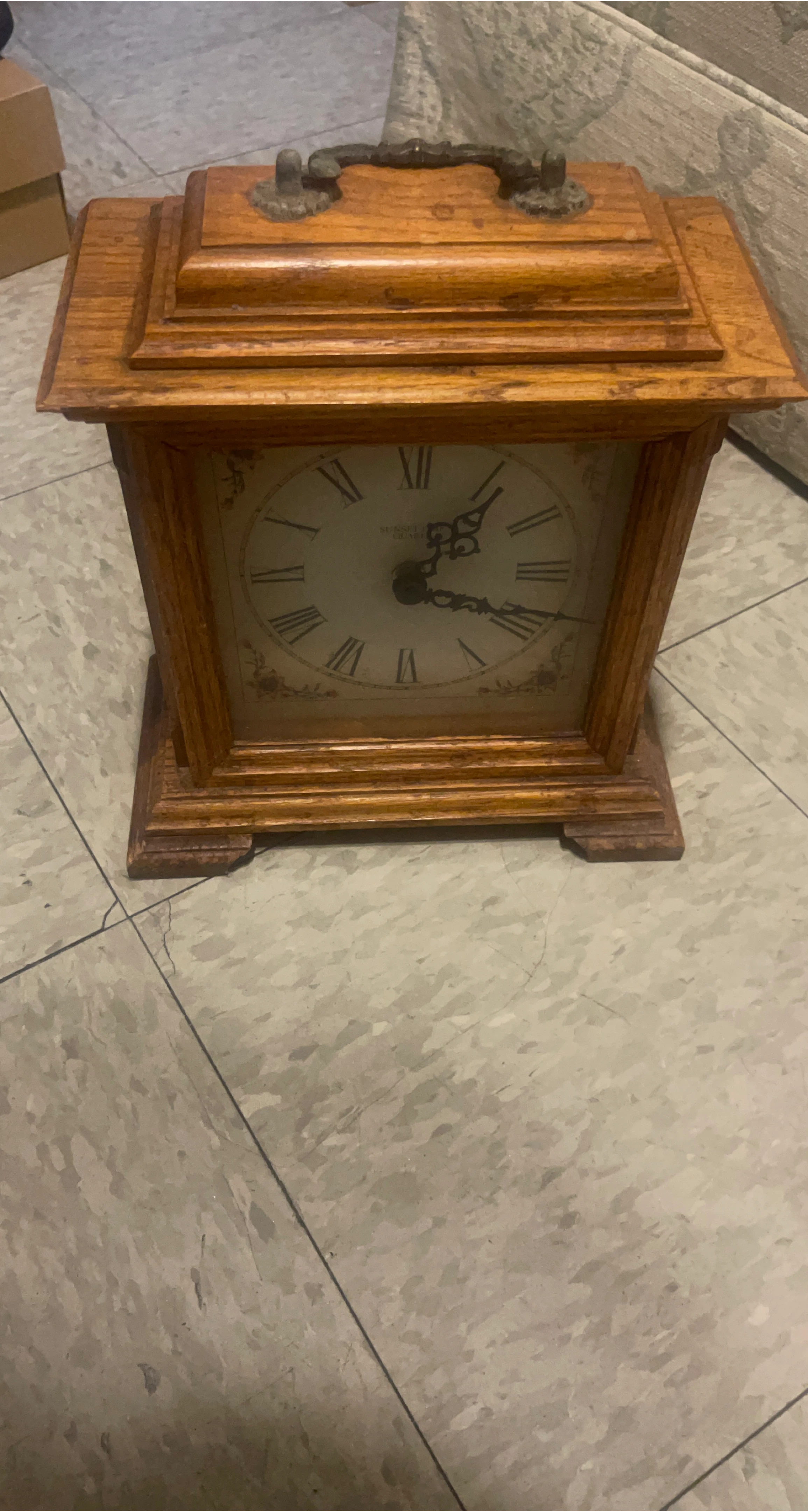 20Selling a Sunset Quartz mantel clock. It's in good condition and would look great on any mantel or shelf. The clock has a classic design with Roman numerals and a wooden frame.