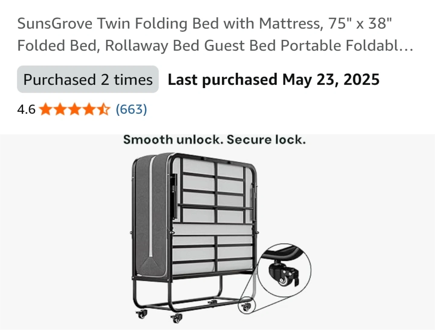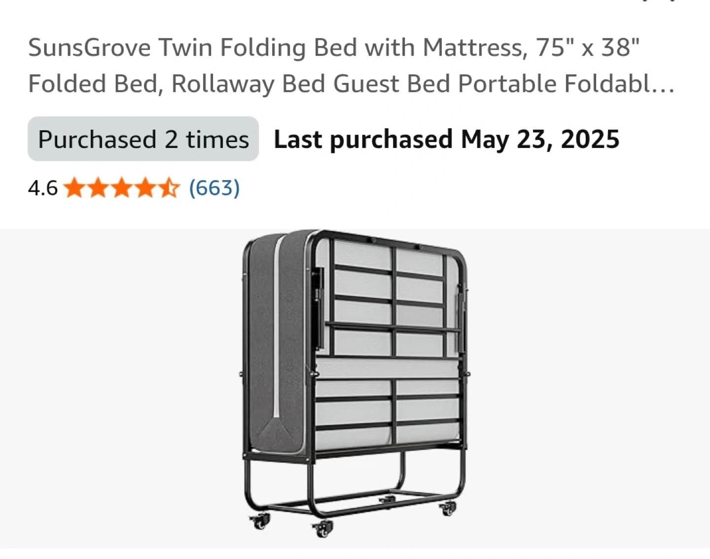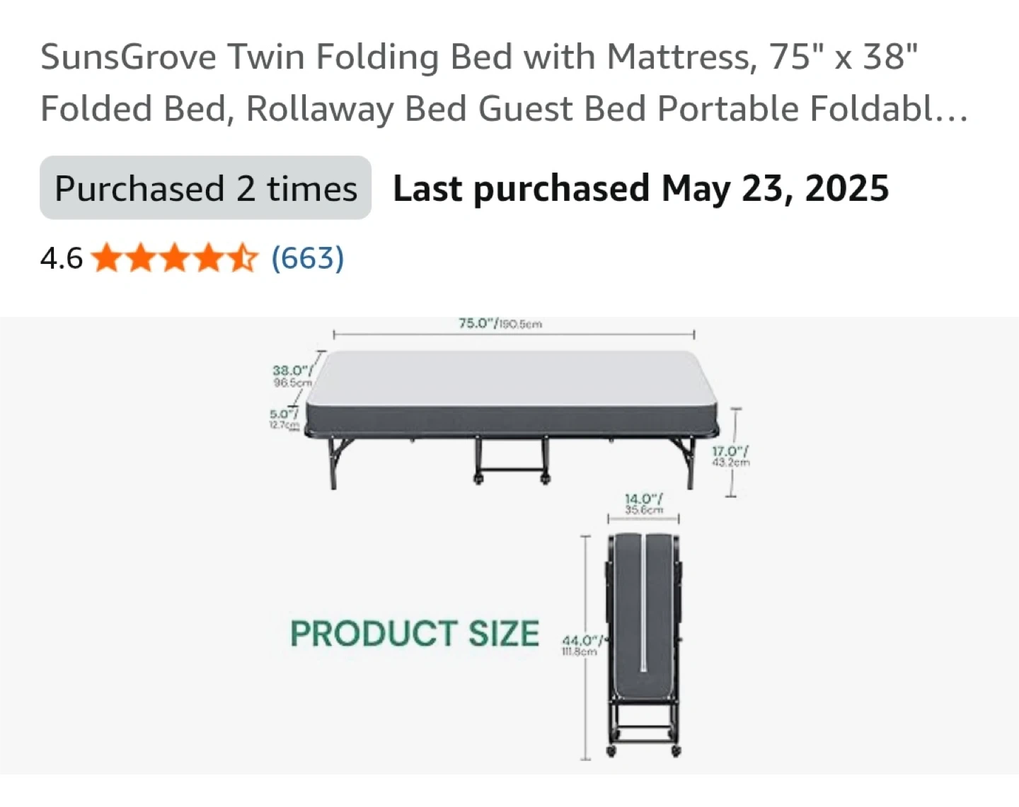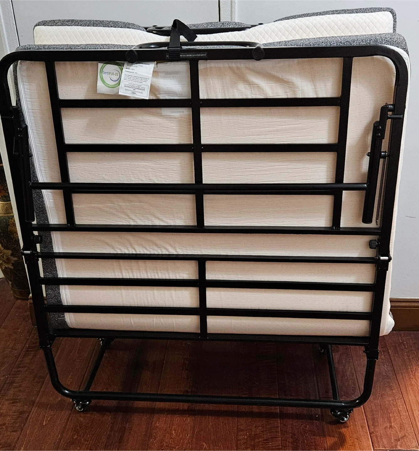 Selling a SunsGrove Twin Folding Bed with Mattress, perfect for guests or small spaces! The bed measures 75" x 38" when unfolded. It's a rollaway bed that's portable and foldable for easy storage. It features a smooth unlock and secure lock mechanism Amazon purchased for guest use for 2 weeks. Excellent condition. $175
