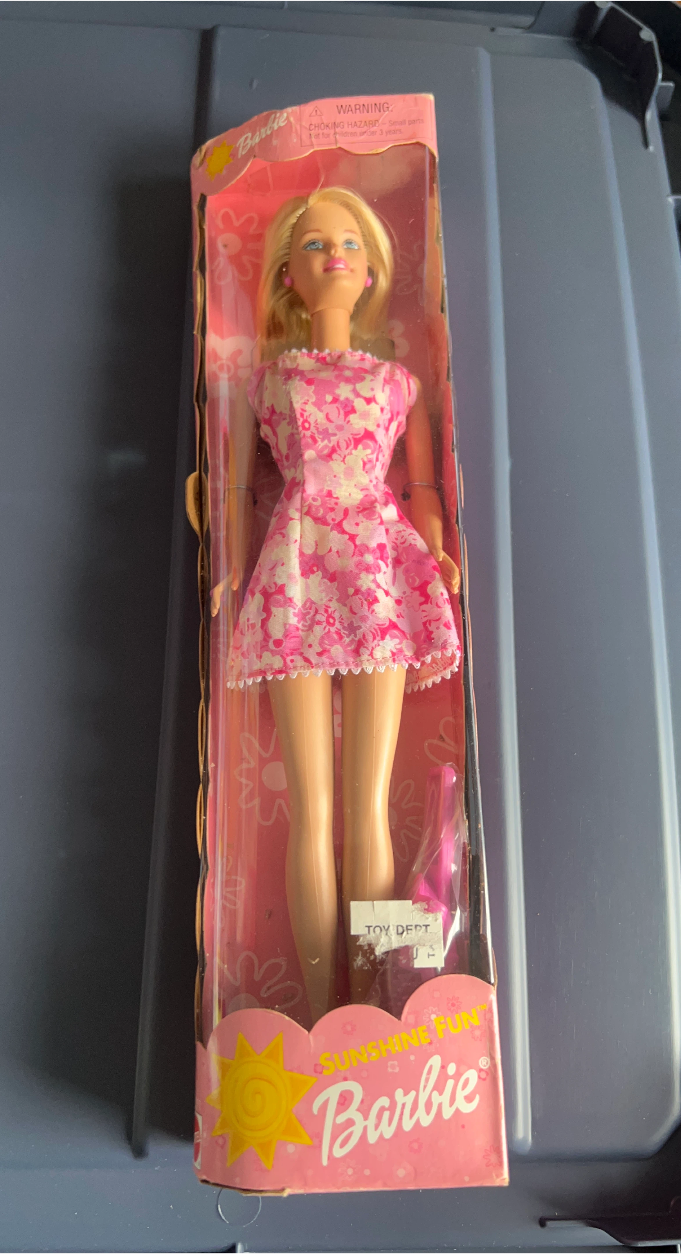 Selling a Sunshine Fun Barbie doll in its original packaging! The box has a warning label for small parts and choking hazards for children under 3 years old. This Barbie has a cute pink and white floral dress and comes with a pink accessory