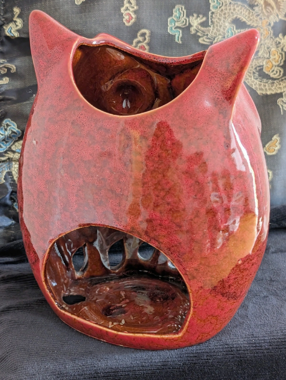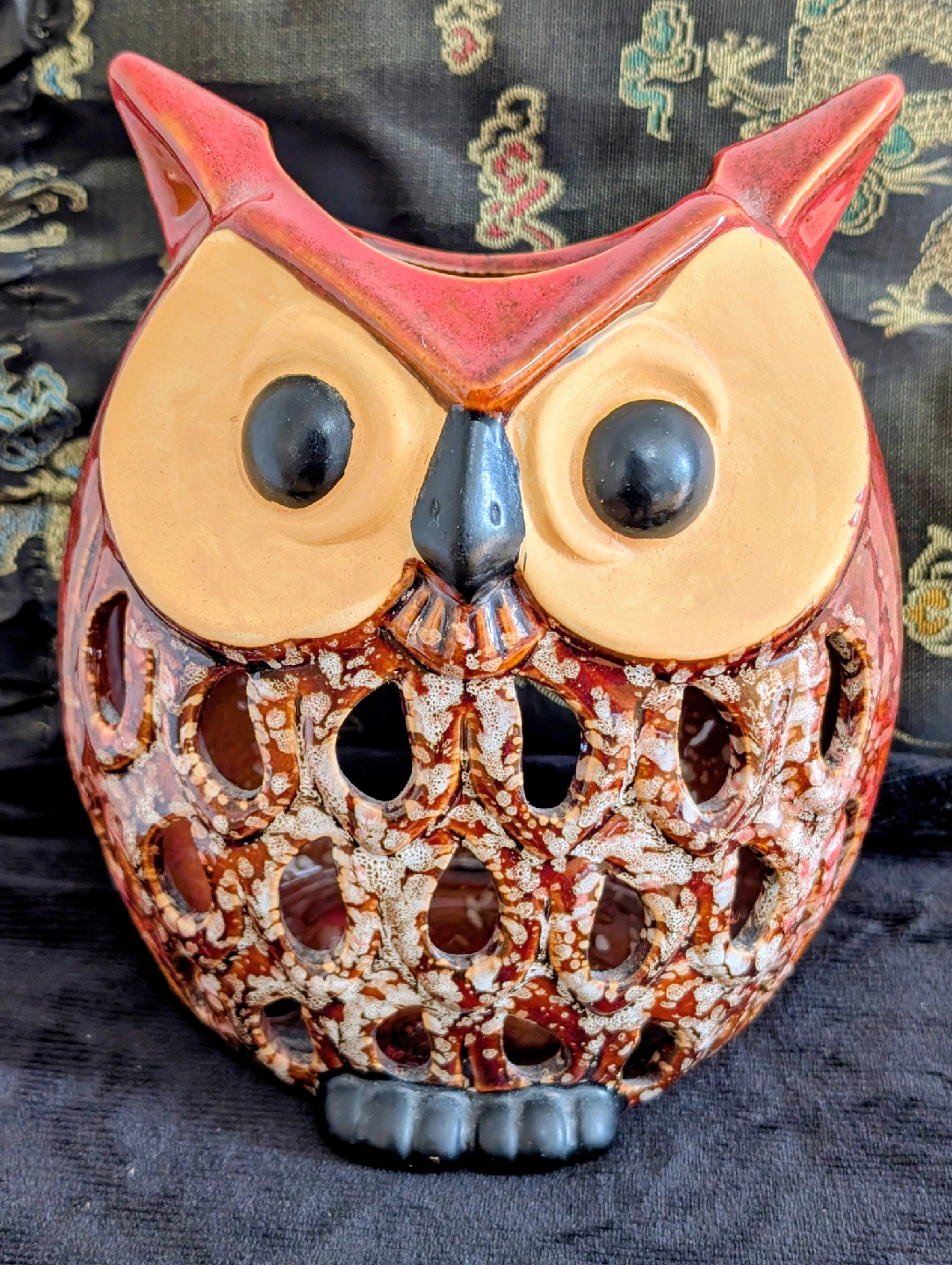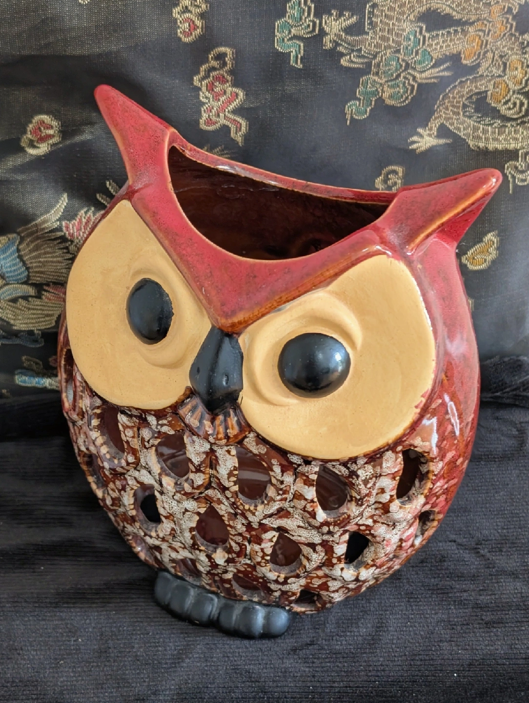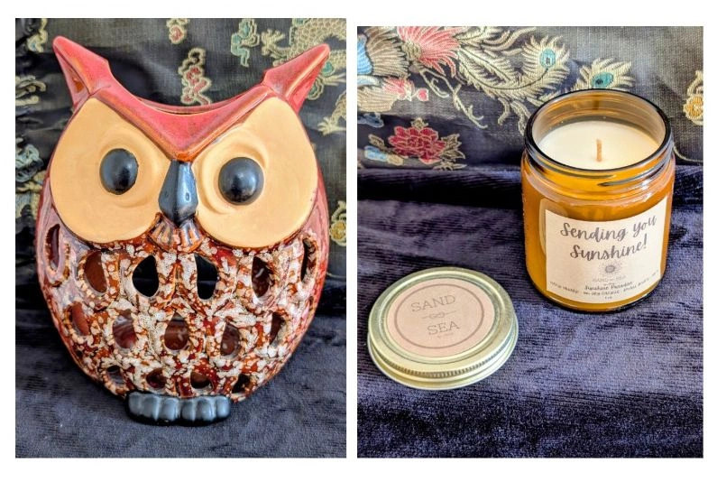 Bring some cozy, nostalgic, and sunny vibes to your home with this unique two-piece candle and decor bundle! Perfect for a gift or to add a warm, retro touch to your own space. What's Included: Vintage Ceramic Owl Candle Holder/Luminary (Lantern): Style: Groovy 1970s/Mid-Century Modern (MCM) aesthetic. Color/Glaze: Rich, glossy terracotta/burnt orange and tan glaze with a textured, speckled finish on the body. Function: Designed to hold a votive or tea light candle (like the one pictured, or a small pillar candle) to cast beautiful, patterned shadows through the cut-out design on the owl's body. Condition: Excellent vintage condition. No chips or cracks. "Sending You Sunshine!" Jar Candle (New): A beautiful, uplifting jar candle with a sunny yellow wax and a friendly label that says "Sending you Sunshine!". The scent and message make it perfect for a "thinking of you" gift or to brighten a room. Condition: New, unburned. Comes with a gold-tone lid. The round "Sand & Sea" accent tin shown in the photo is included as a decorative accent piece. Why buy this bundle? Instant Decor: Everything you need for a cozy, charming display. Great Value: Get a piece of genuine vintage home decor and a new, lovely-smelling candle for one low price. Unique Gift: A thoughtful and unique gift for an owl collector, a vintage decor lover, or someone who needs a little sunshine!