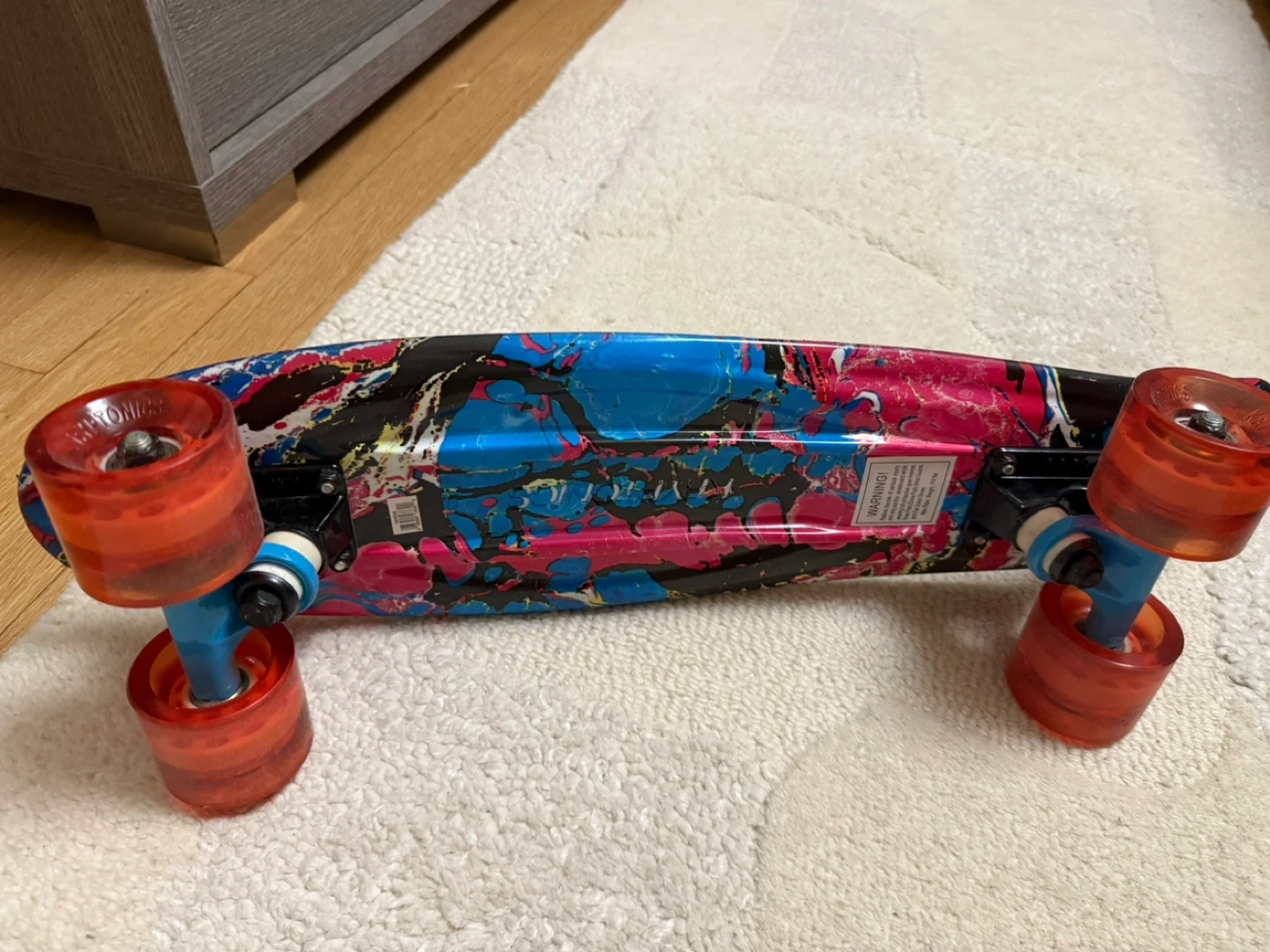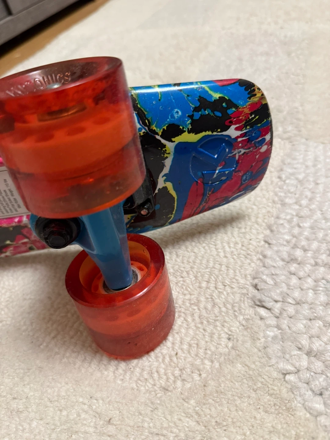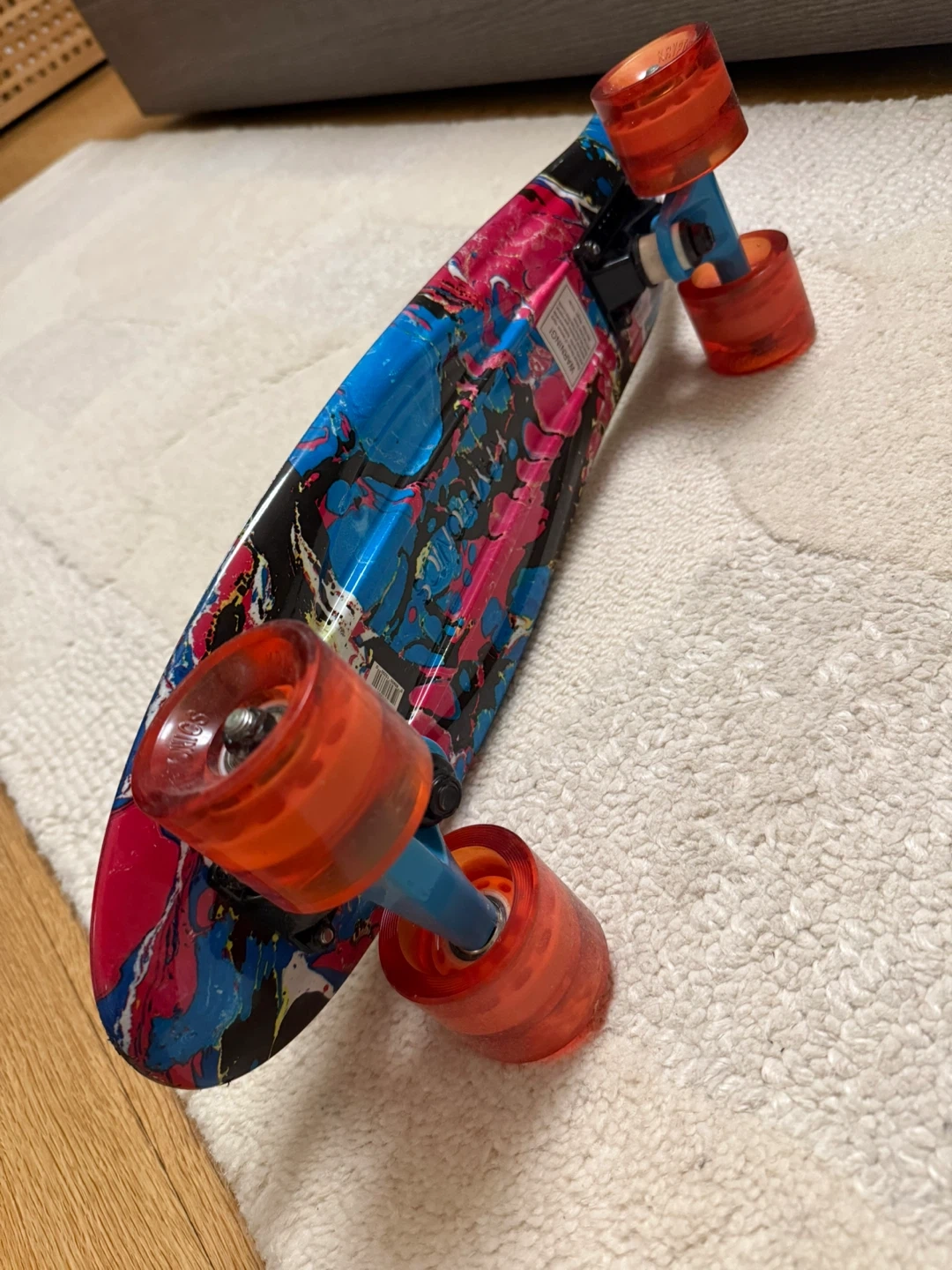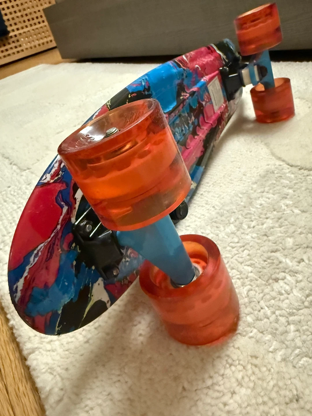 Selling a Suntopia Originals skateboard! Used once, perfect condition. It has a colorful design with red wheels and blue accents. Perfect for cruising around town.