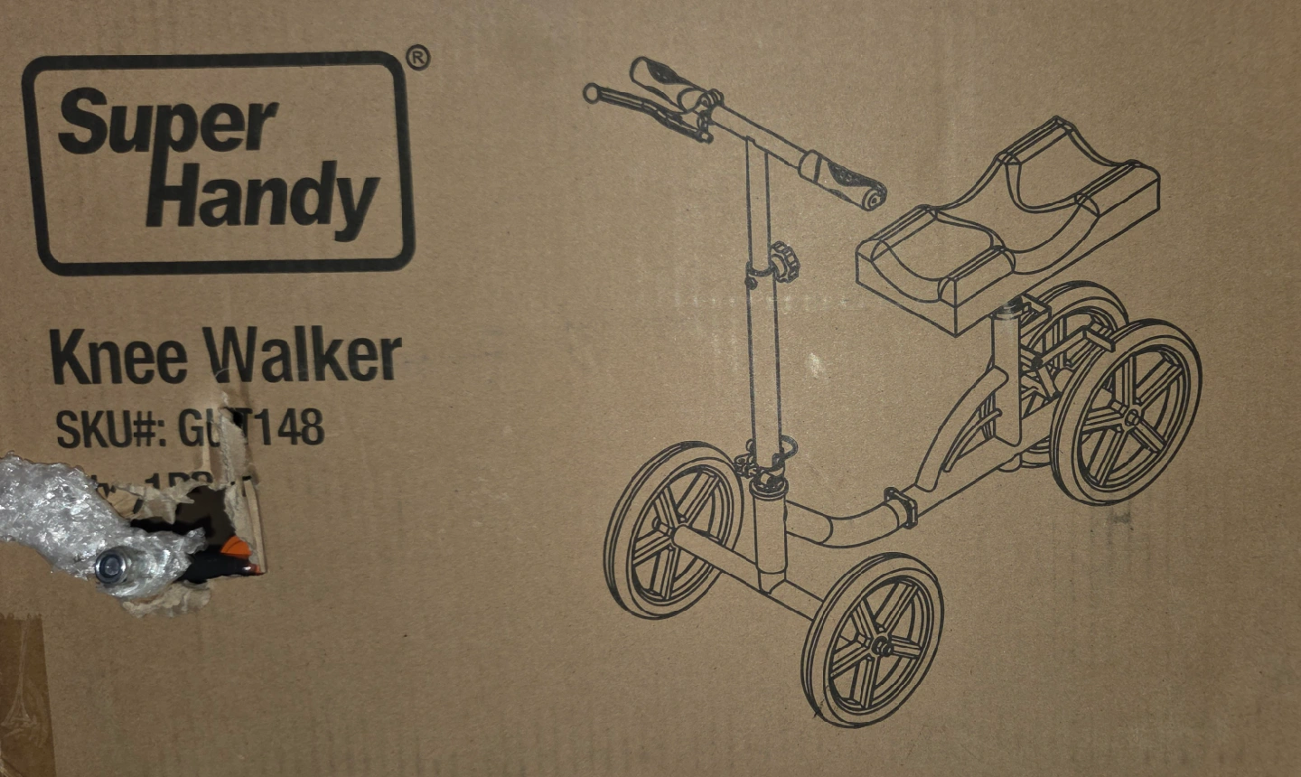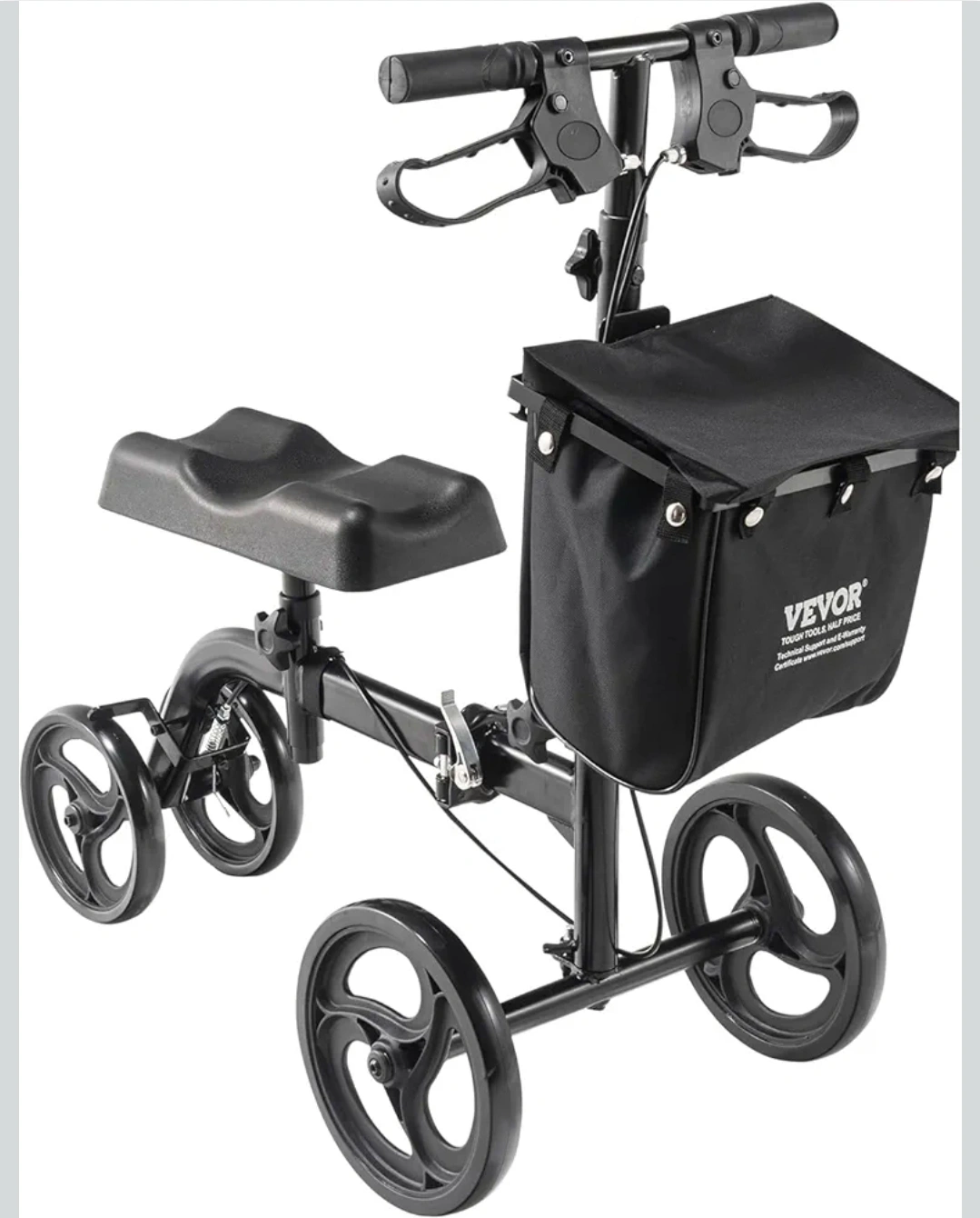 I'm selling a Super Handy Knee Walker, model GL1148. It's in great condition and ready to help you get around comfortably while recovering. The VEVOR logo is visible on the attached basket. It comes with the original box!