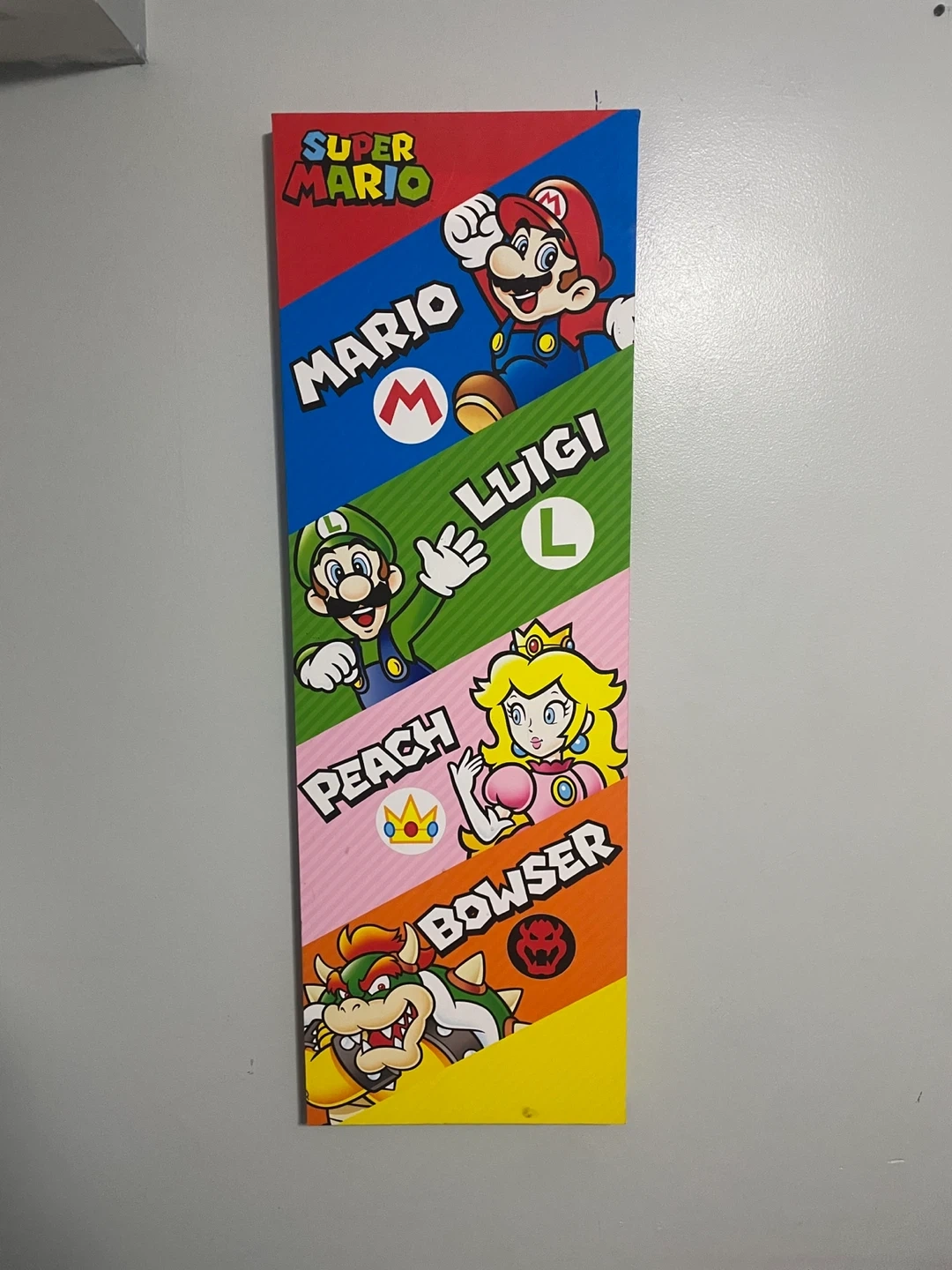 Selling a Super Mario canvas wall art featuring Mario, Luigi, Peach, and Bowser! It's in great condition and ready to add some fun to any room