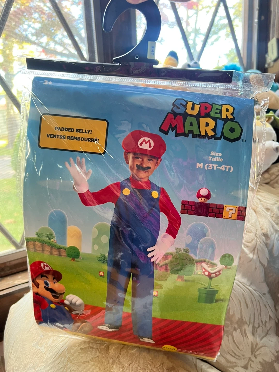 65I'm selling a worn once Super Mario costume! It's size medium (3T-4T) and even has a padded belly for extra fun. Perfect for Halloween or dress-up!