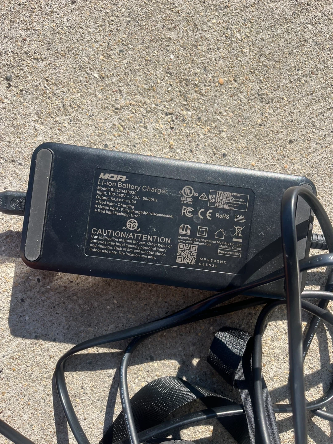 Selling a SUPER73 Li-ion Battery Charger, model BC323480030. It's in good condition and ready to power your SUPER73 e-bike. Input: 100-240V~2.5A, 50/60Hz; Output: 54.6V==3.0A