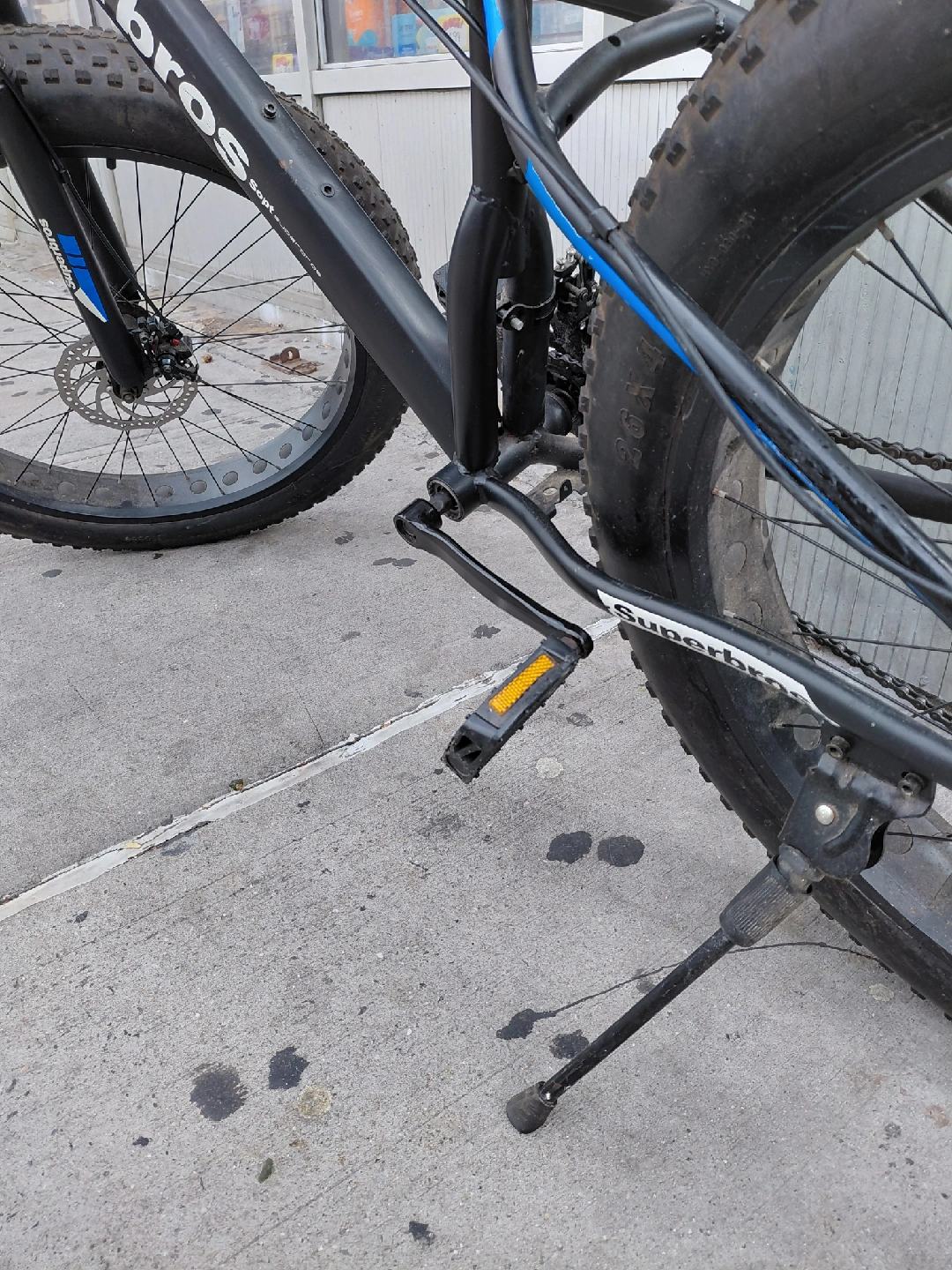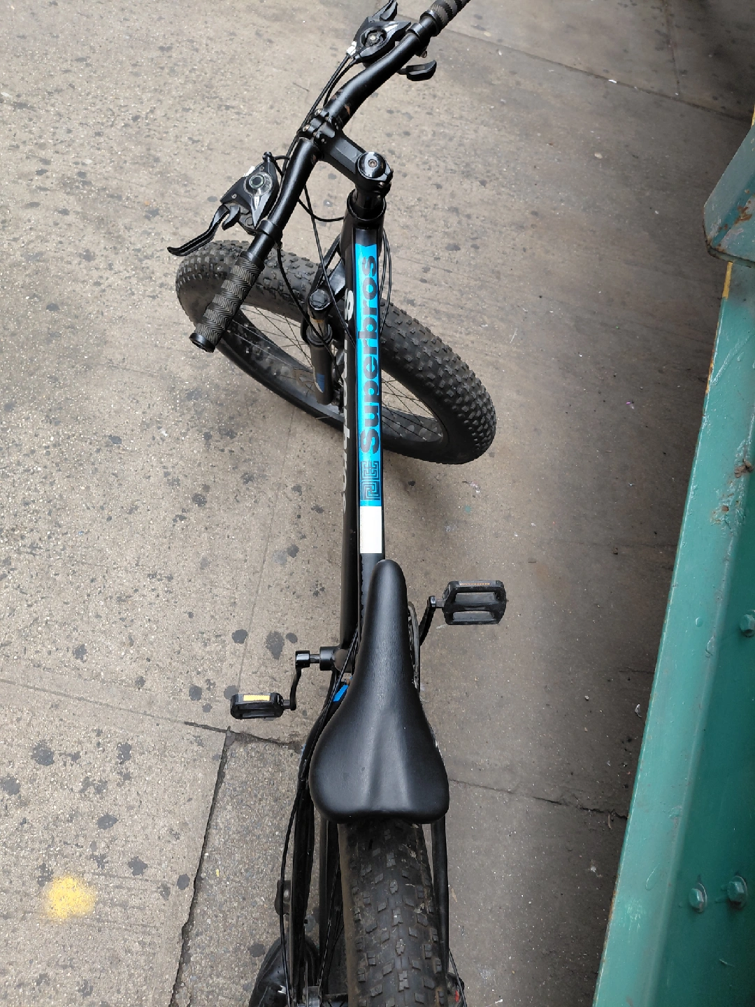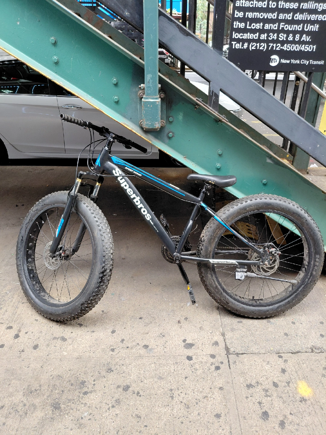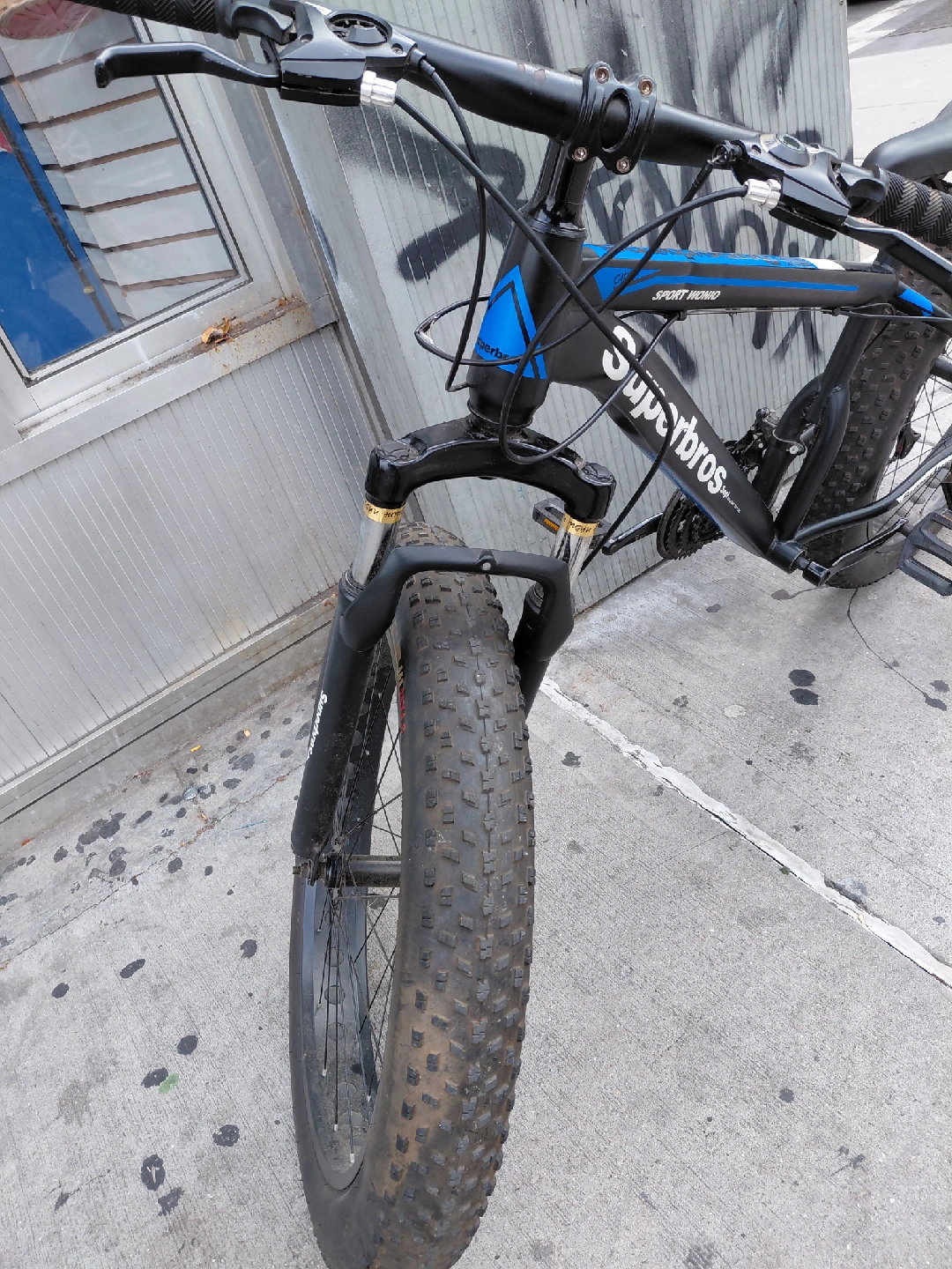 65Selling a Used Superbros fat tire bike from the Sport Series! It's black with blue accents and ready for some fun rides. It has a kickstand too! You would have to get the seat fixed so it doesn't move well you ride and the gears fix but besides those it's a working bike.