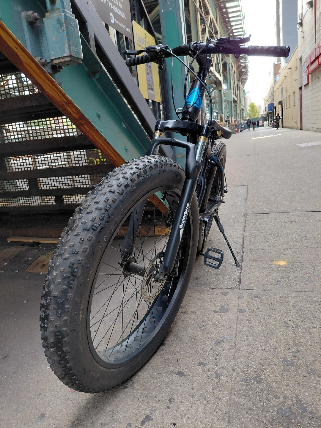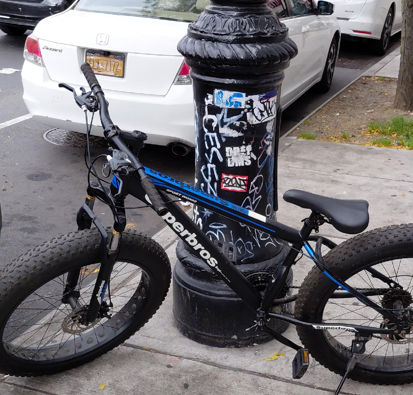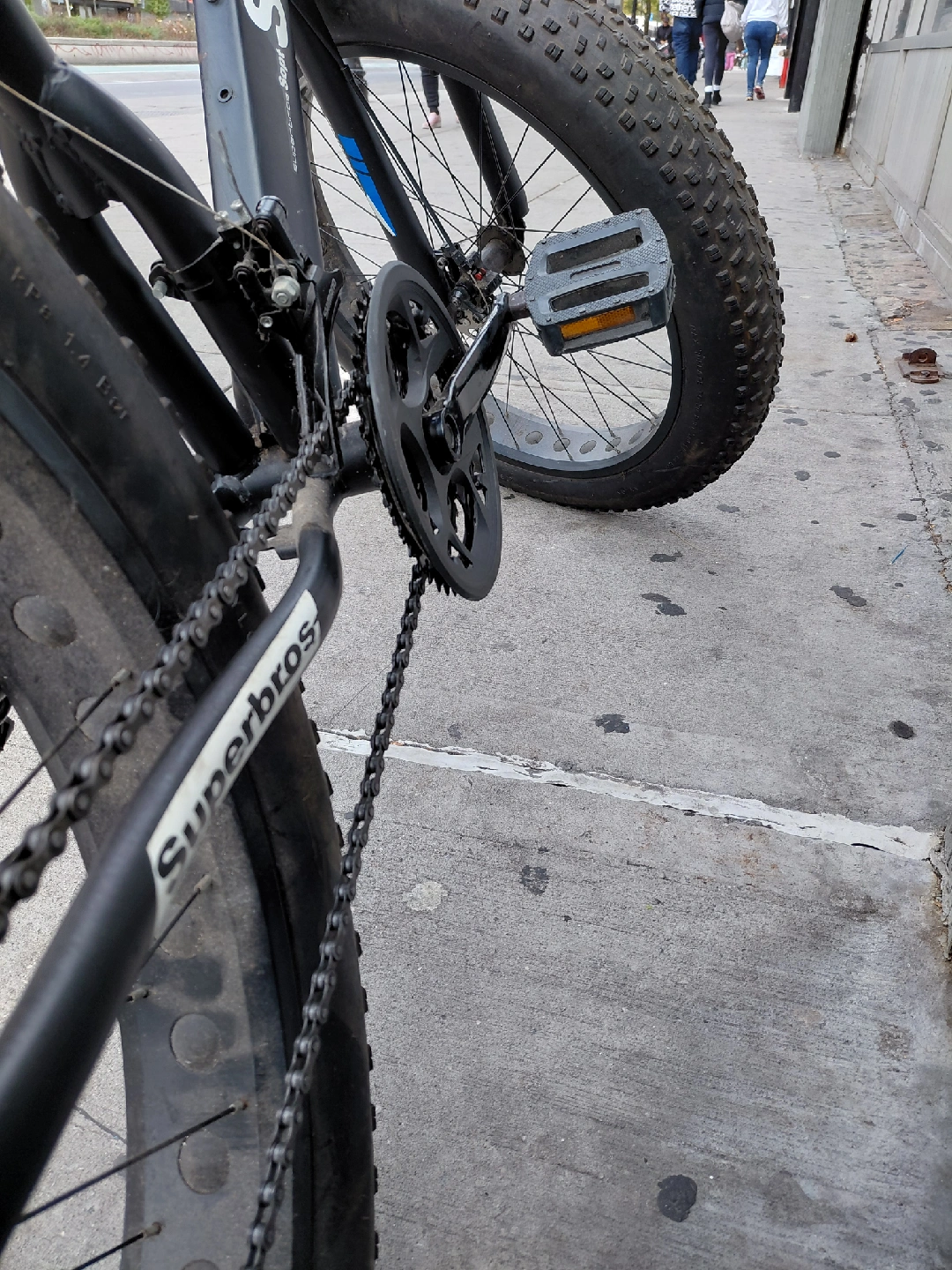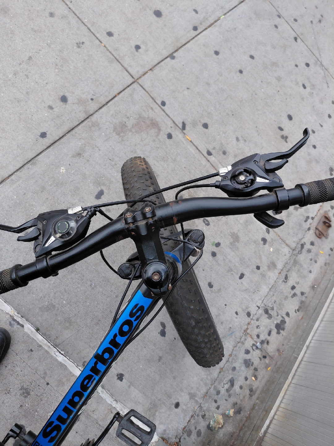 65Selling a Used Superbros fat tire bike from the Sport Series! It's black with blue accents and ready for some fun rides. It has a kickstand too! You would have to get the seat fixed so it doesn't move well you ride and the gears fix but besides those it's a working bike.