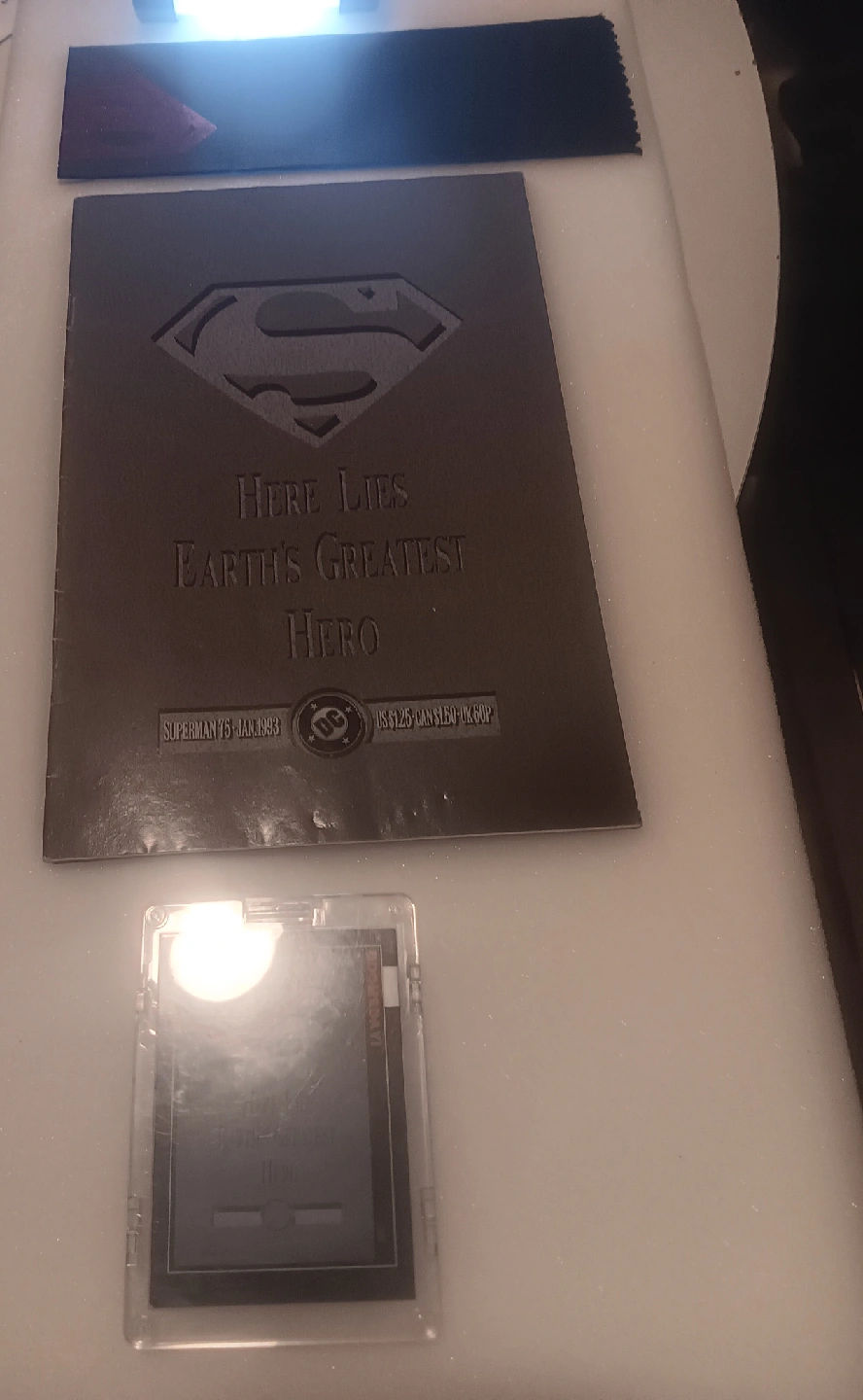 I'm selling a Superman comic book. It appears to be a commemorative edition titled "Here Lies Earth's Greatest Hero" with the Superman logo embossed on the cover. It also has the DC Comics logo.